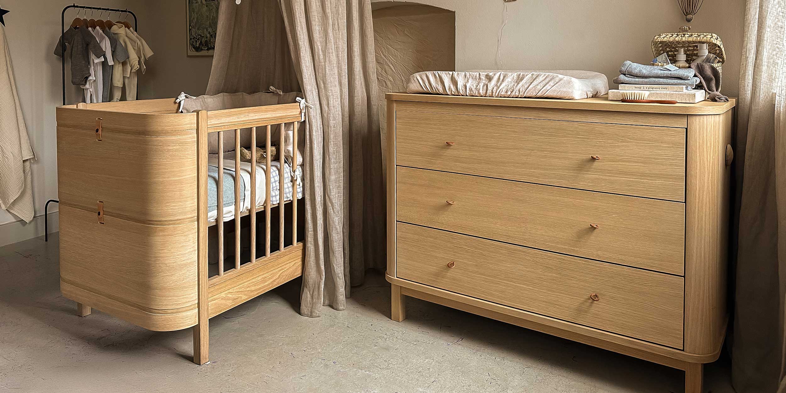 Discover our best selling bed of all times, Oliver Furniture's Wood Mini+ Cot. Designed to grow with your child, you can easily change this cot from baby to toddler to junior bed. When your child ultimately outgrows the bed, a pair of attractive pillows along the backrest transform it to a cosy sofa.