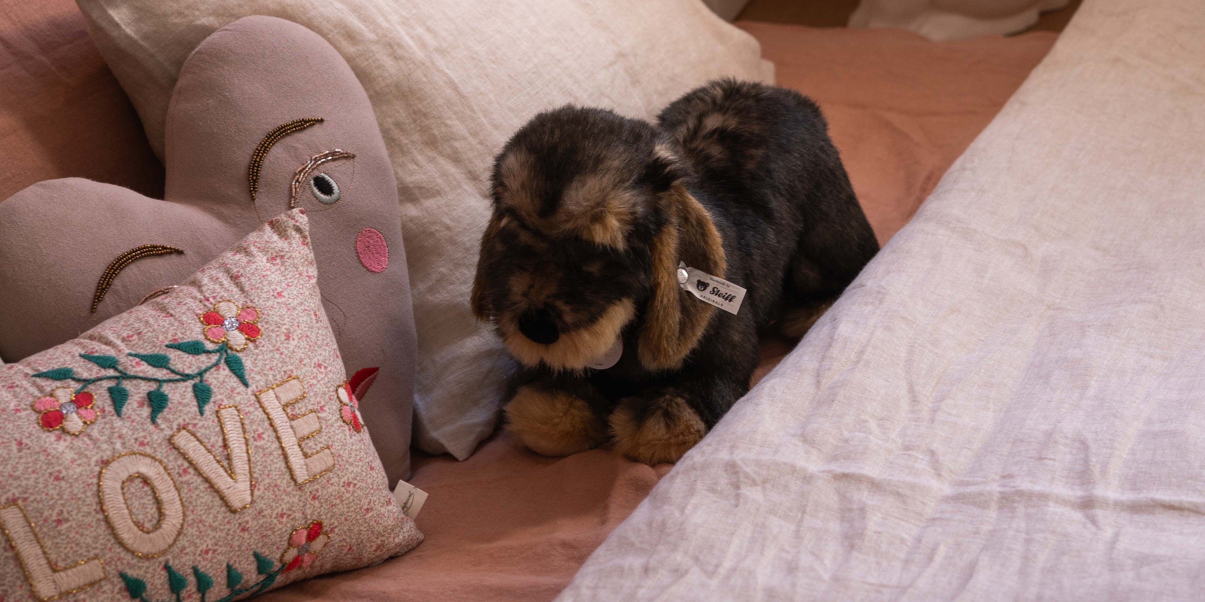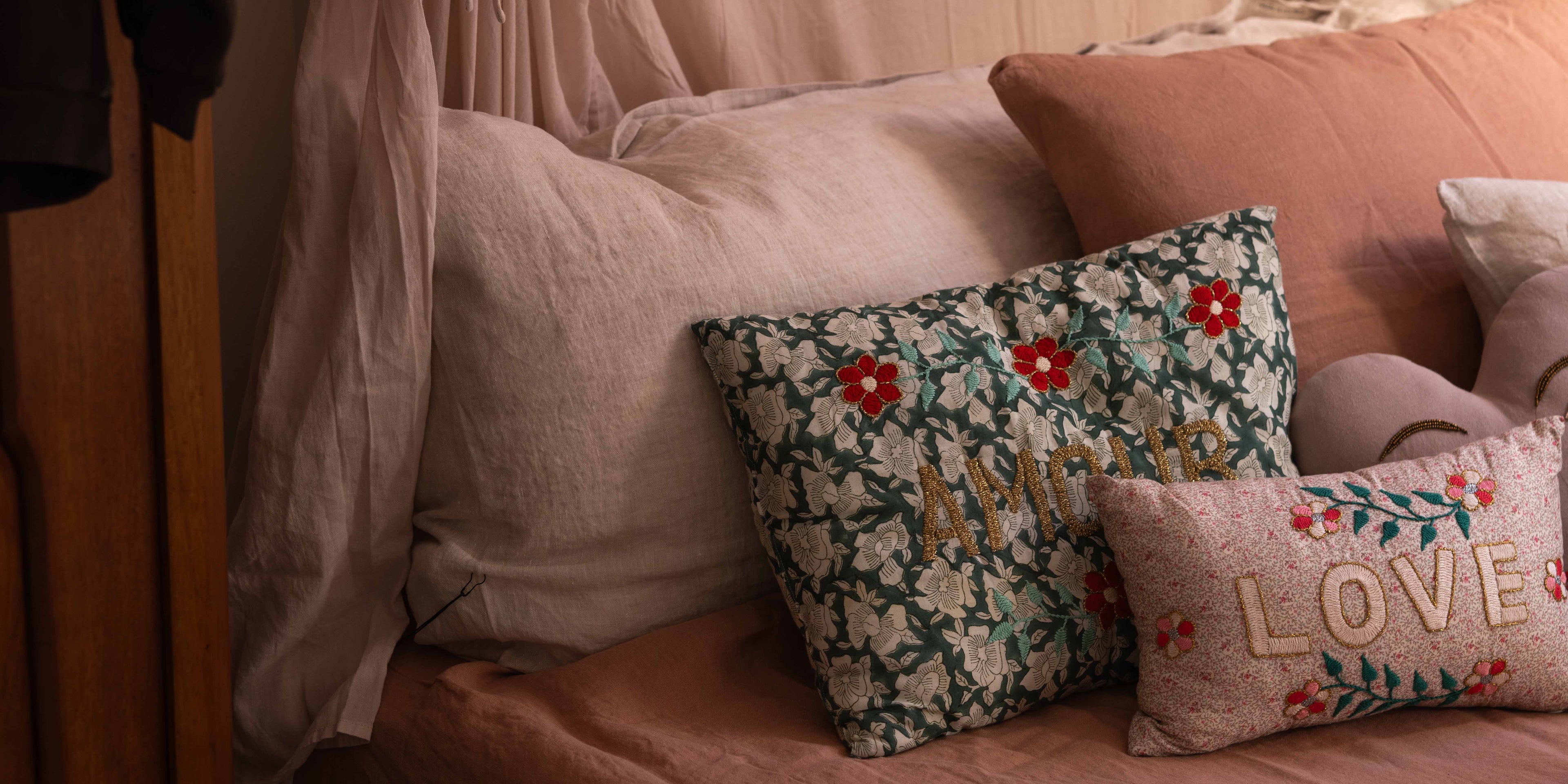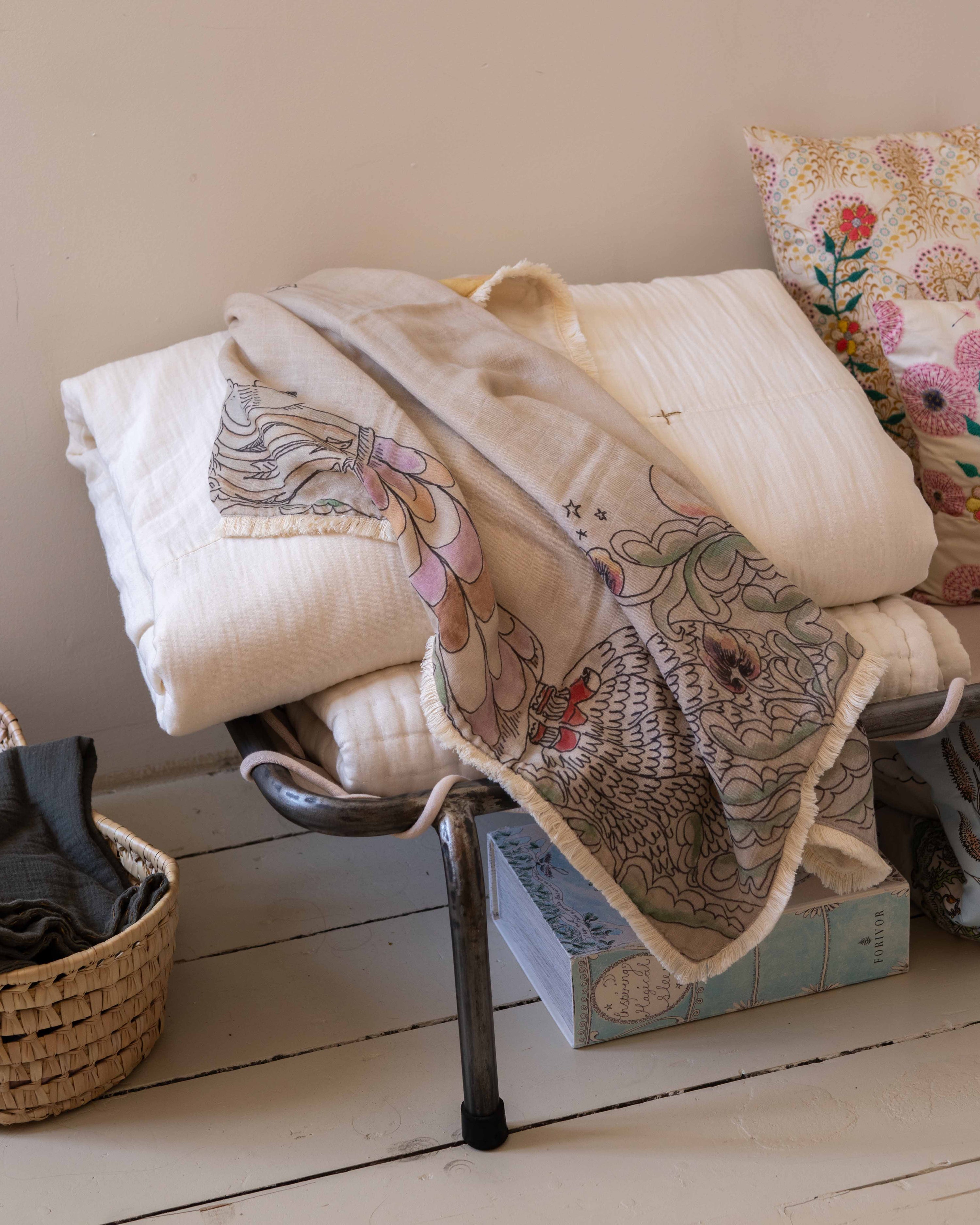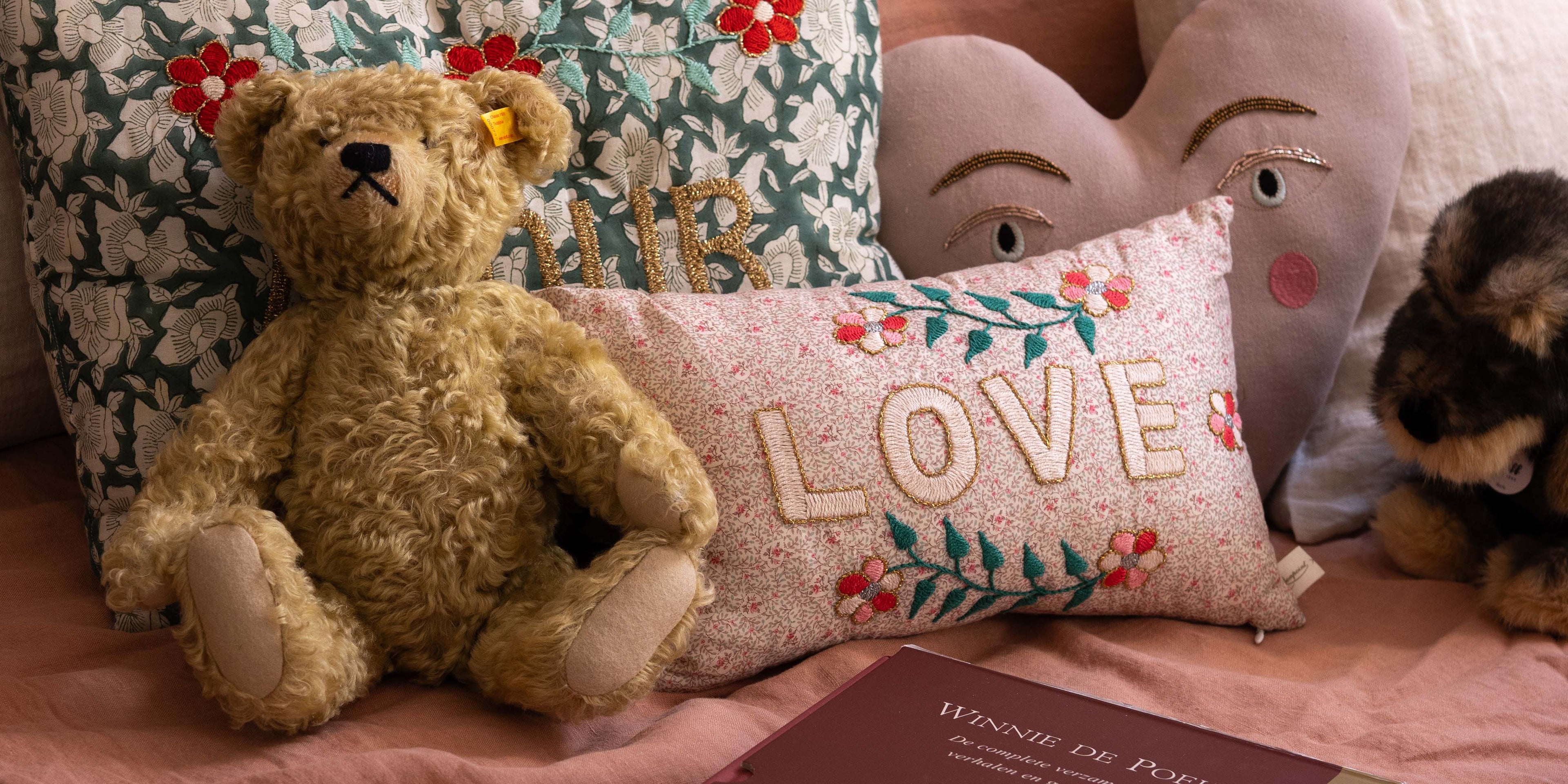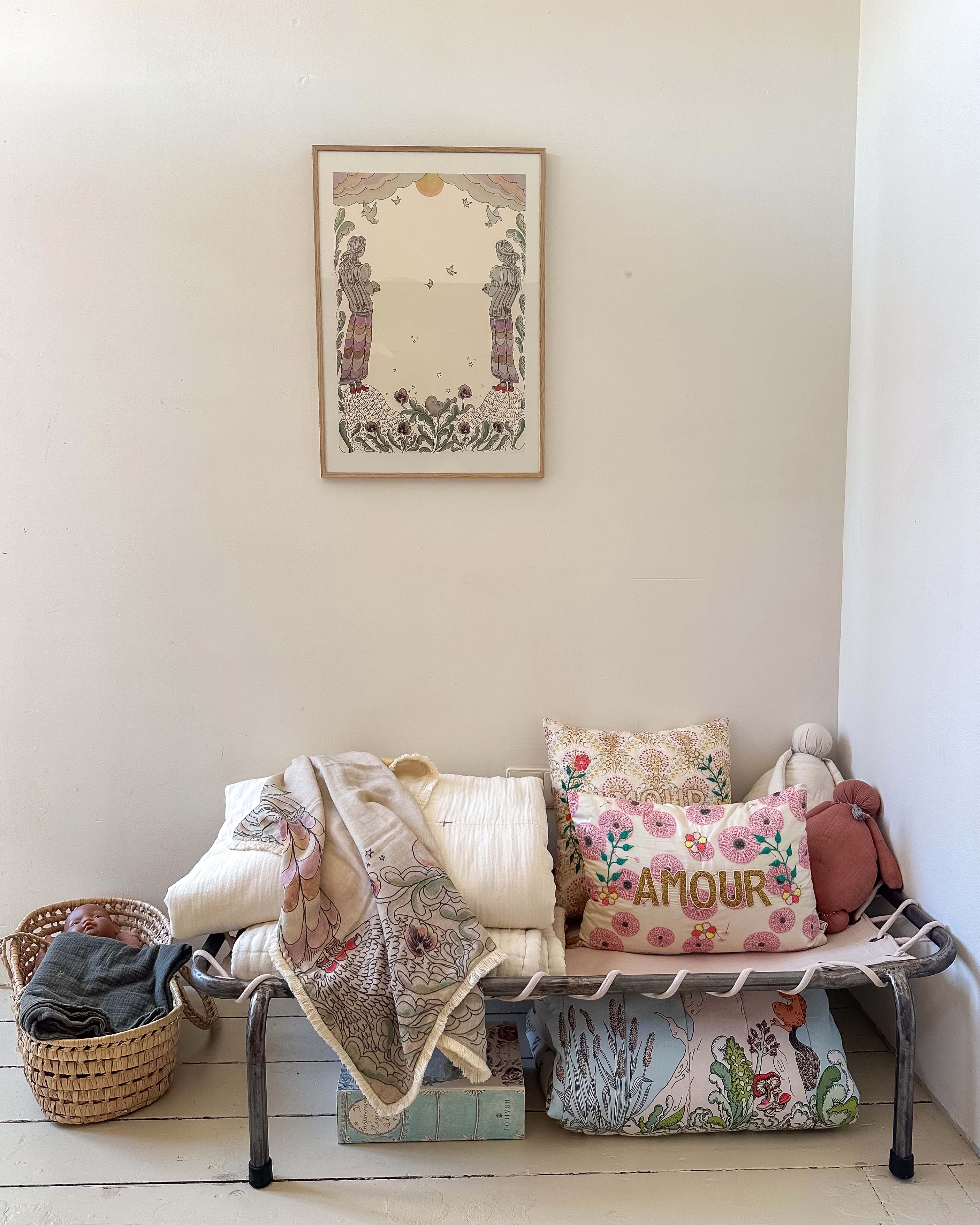 Layer blankets, cushions, and cuddly friends on a little bench for a cozy corner to chill, chat, or read. Add personality with a poster from On Children, whimsical Skippy Cotton ornaments, and those CSAO cushions that bring handmade soul into the mix.
