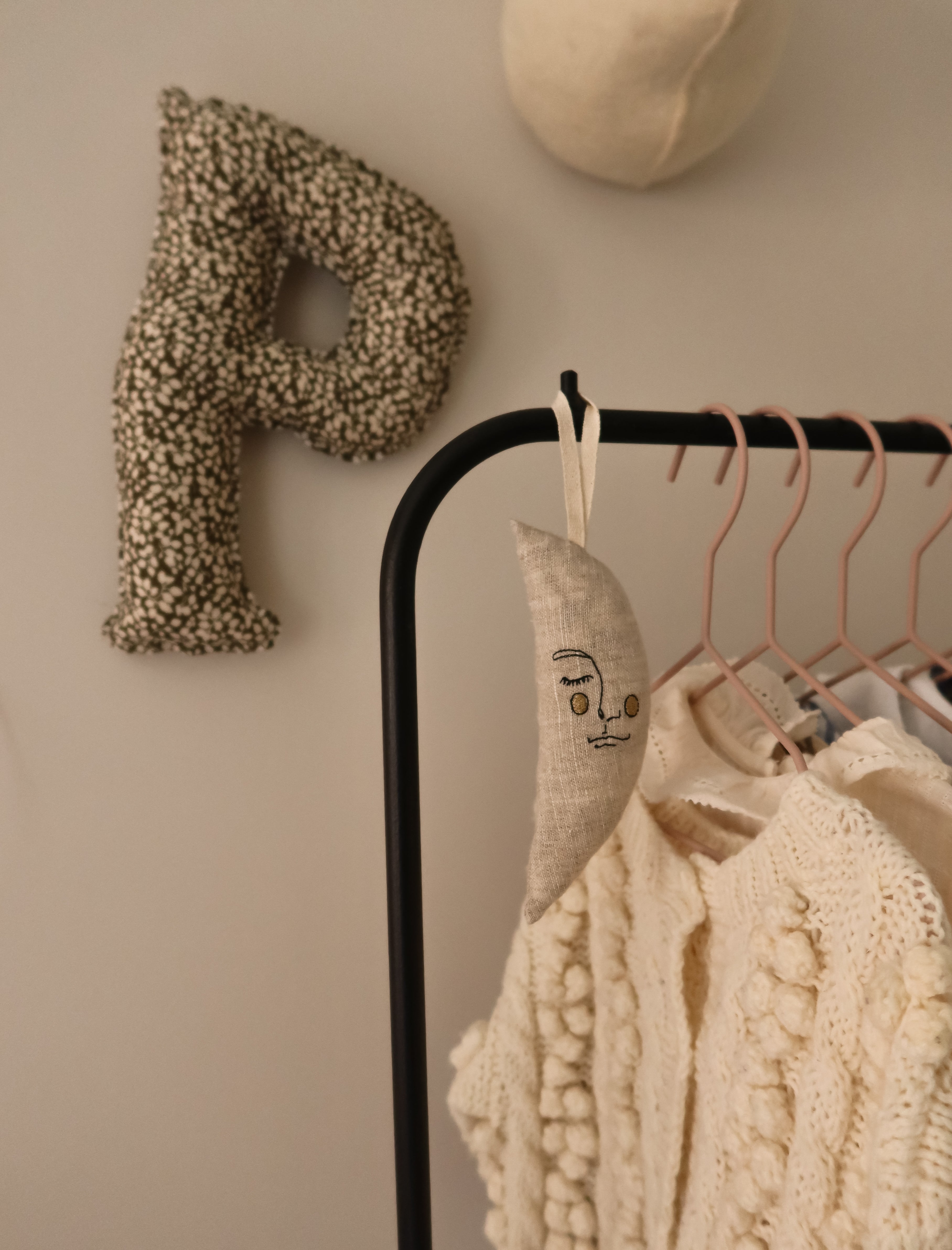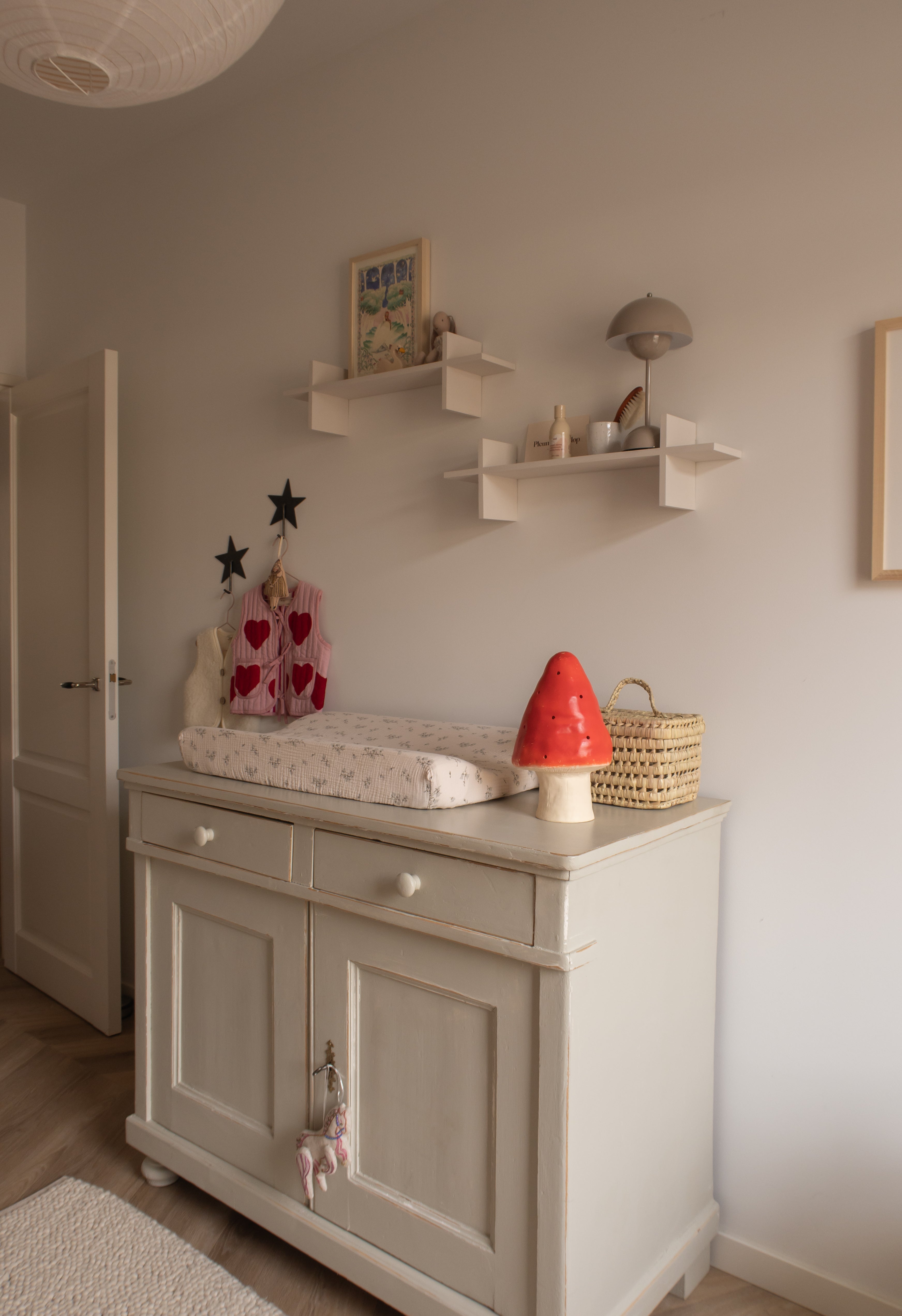 For Pleun’s room, I chose a light neutral base with warm materials. The vintage dresser adds so much charm, and I also added a canopy above her bed for a cozy and inviting feel. Besides that I focused on storage solutions to keep the space tidy. Instead of hiding all her beautiful clothes in a closet, I opted for a metal clothes stand and star hooks on the wall to show them off!