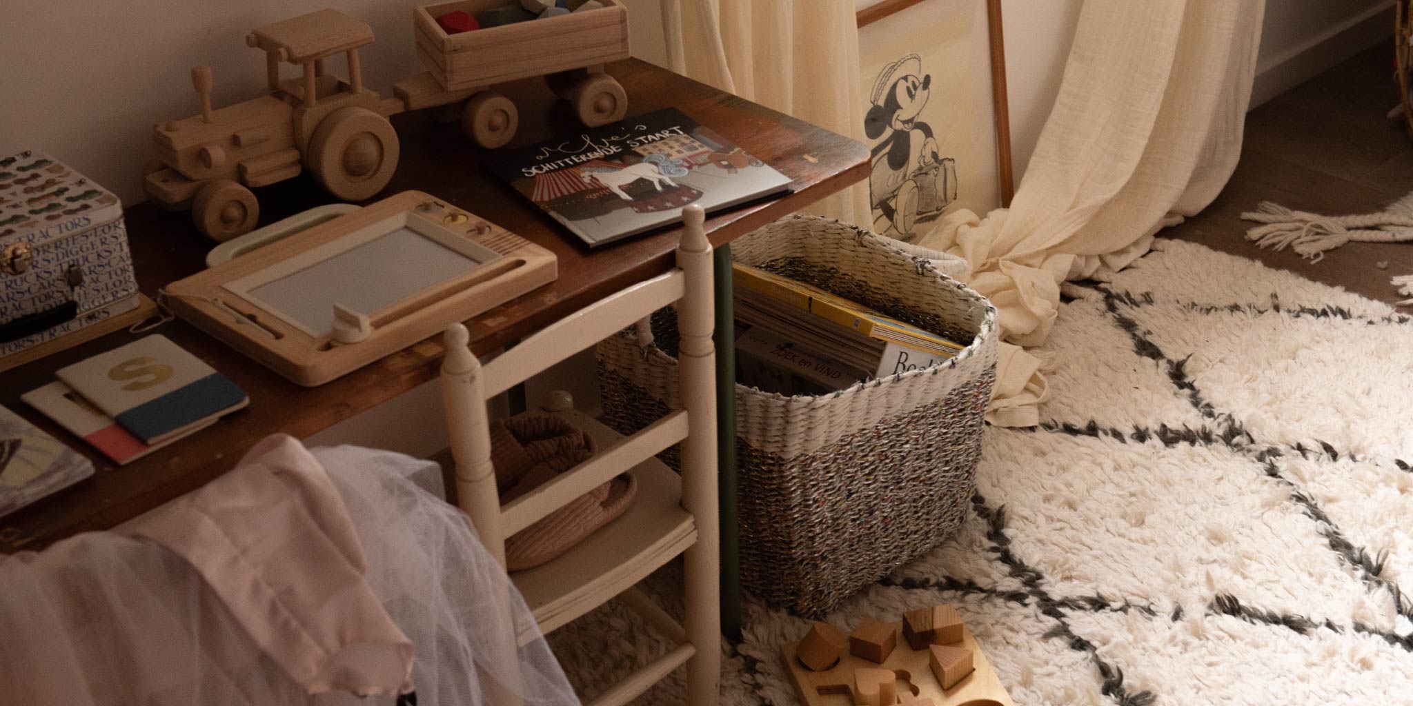 Who says every child needs a separate room? Little Phileine shares her bedroom with her parents, and we believe she wouldn't have it any other way, considering the sweet and dreamy corner she calls her own. Adorned with a fresh white crib dressed in dusty pink bedding, this cozy space reminds us all to cherish those precious moments of childhood.