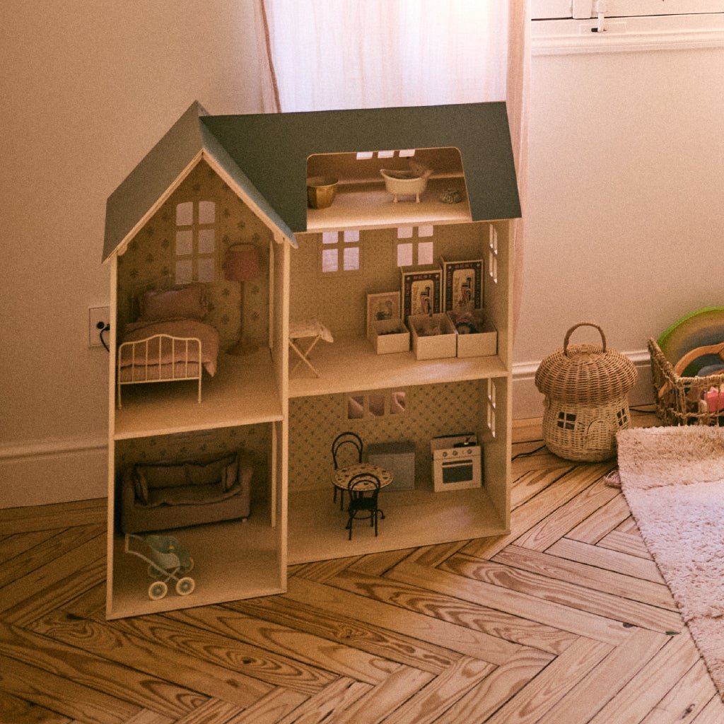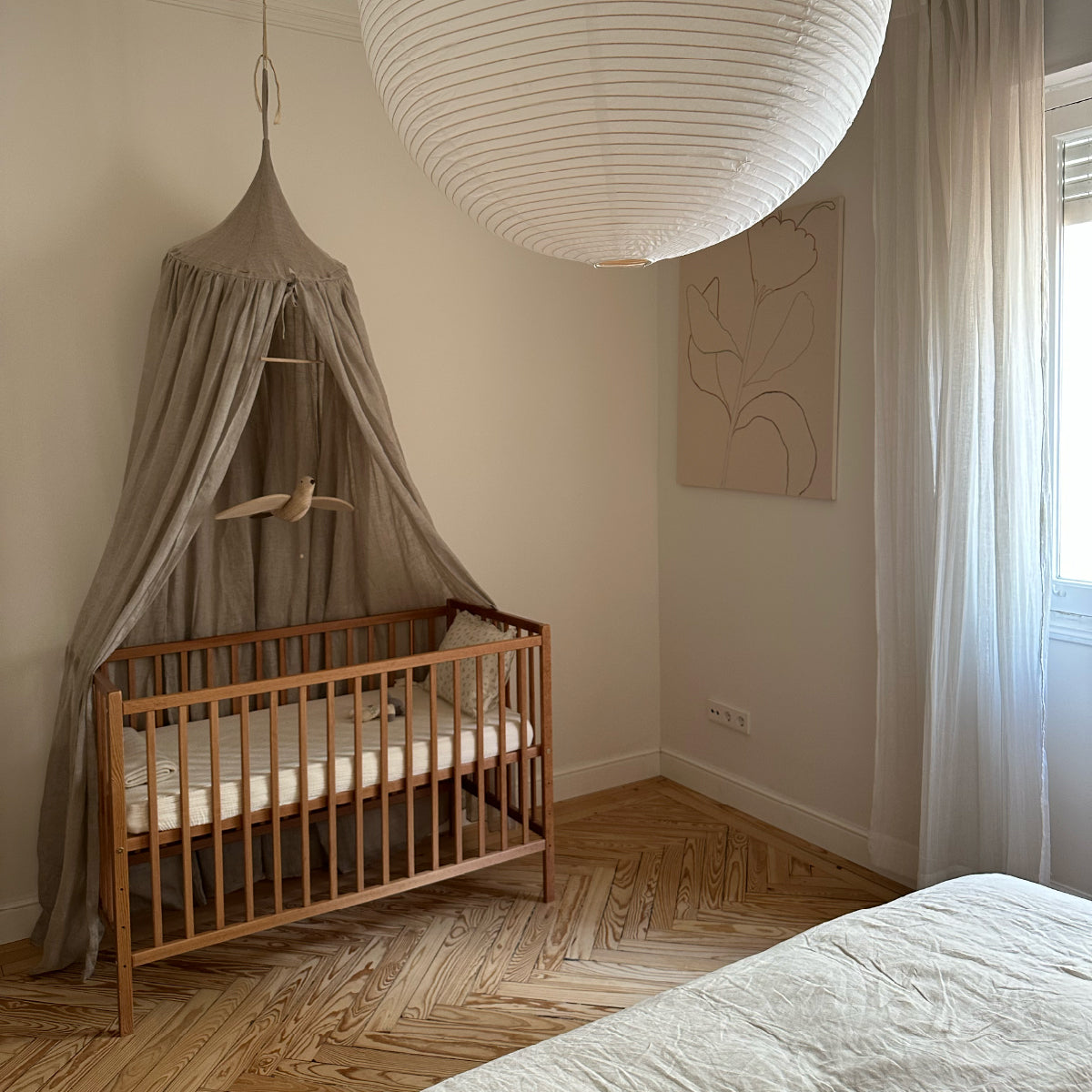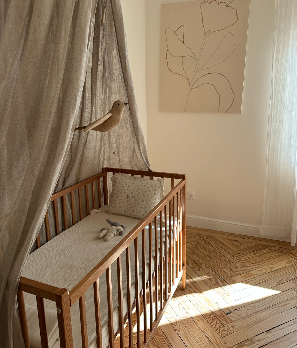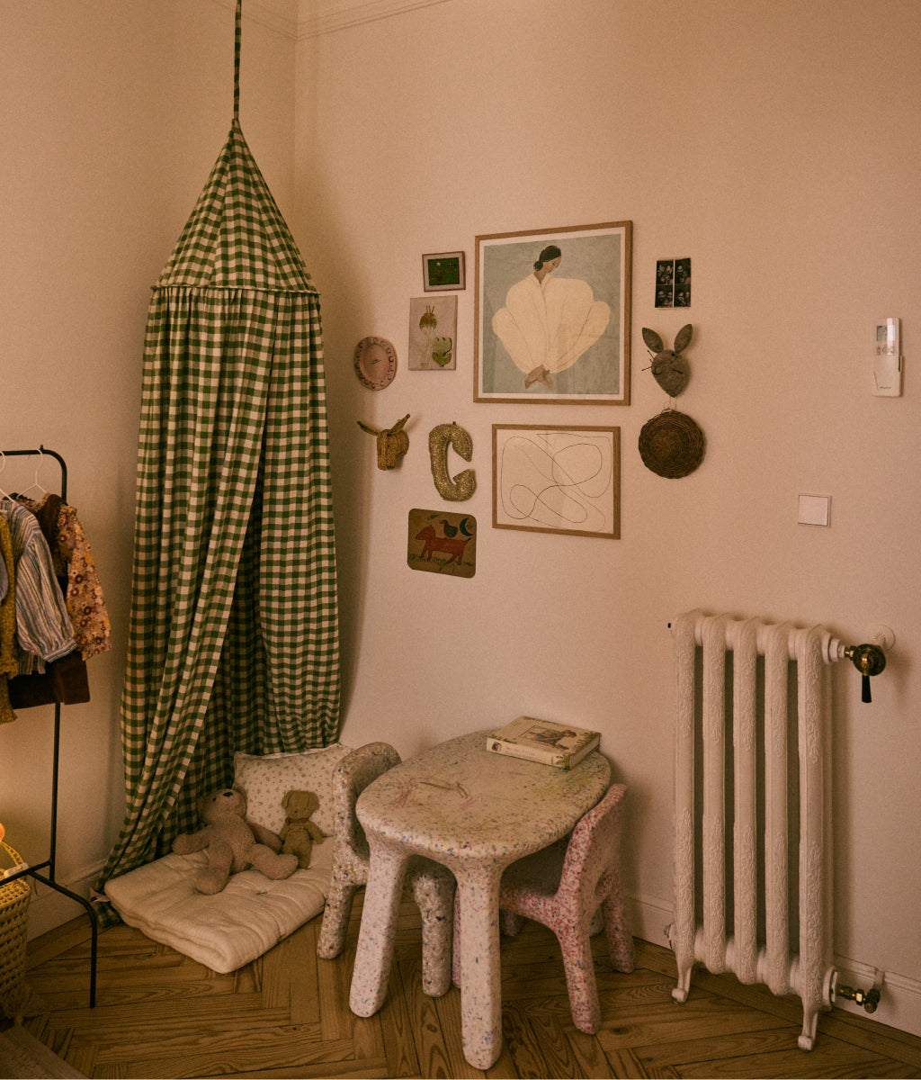 Florencia currently sleeps in our room, so her “space” is a calming corner with a crib and a soft canopy for warmth and coziness. When she’s a little older, we plan to move her into Cecilia’s room and decorate it to reflect both of their personalities. Cecilia’s room has evolved along with her personality—from a minimalist nursery to a playful, organized space that reflects her interests. We have a gallery wall with cherished items, a drawing table, a canopy corner for reading, and her beloved dollhouse. It’s calm yet personal, perfect for a little one with so much energy.