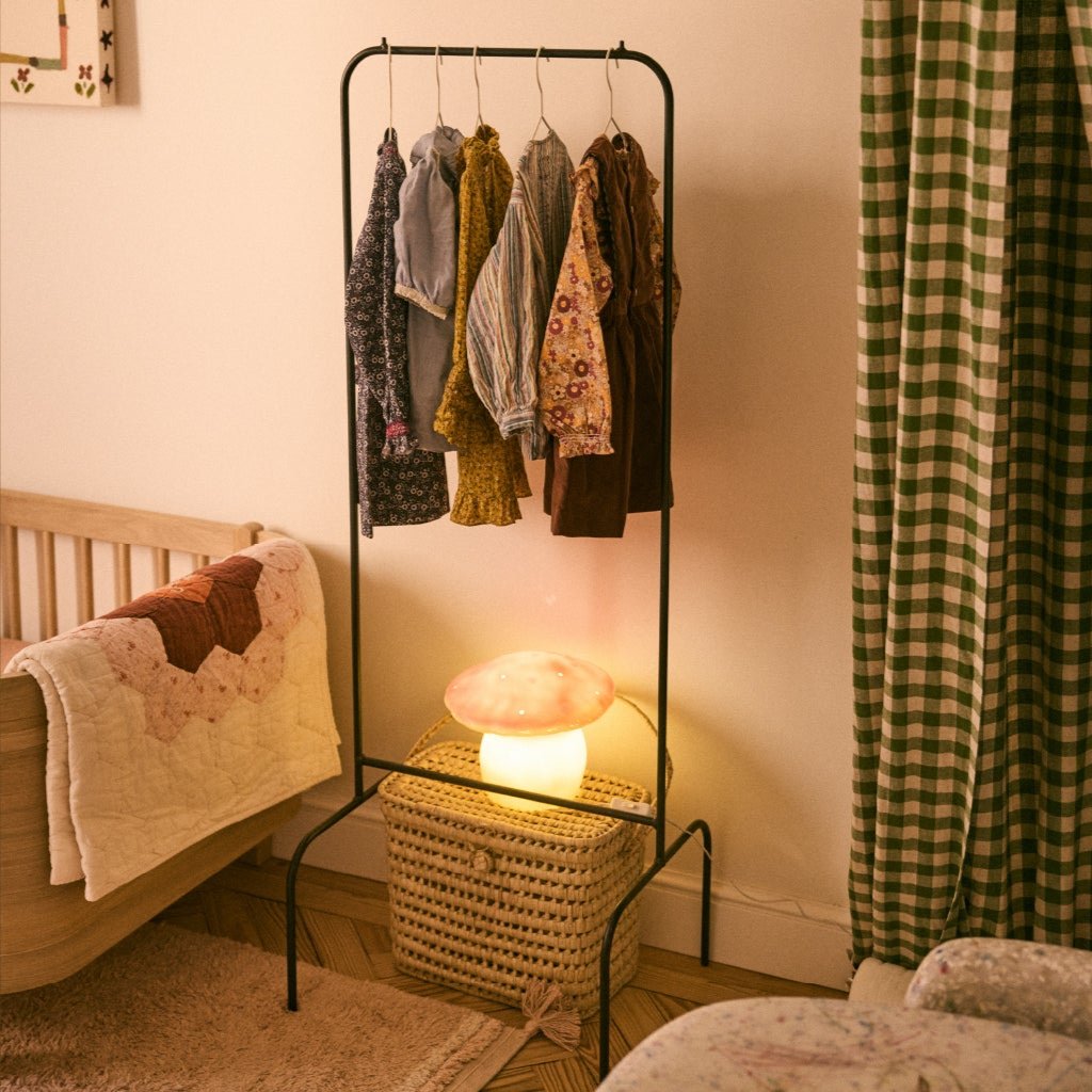 I love the clothing rack for displaying Cecilia’s prettiest outfits, and the moon wall lamp is a favorite as well—it casts the most calming glow, making bedtime more magical.