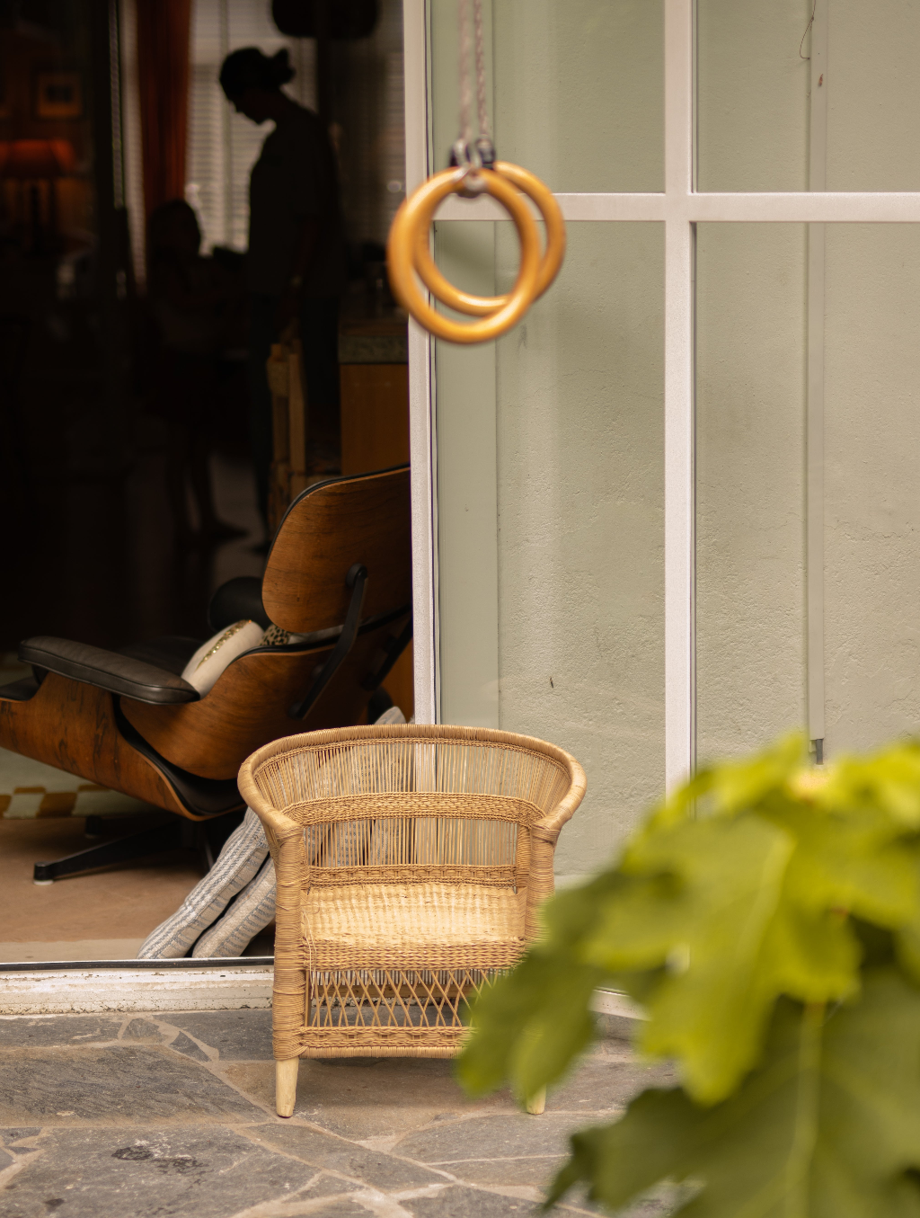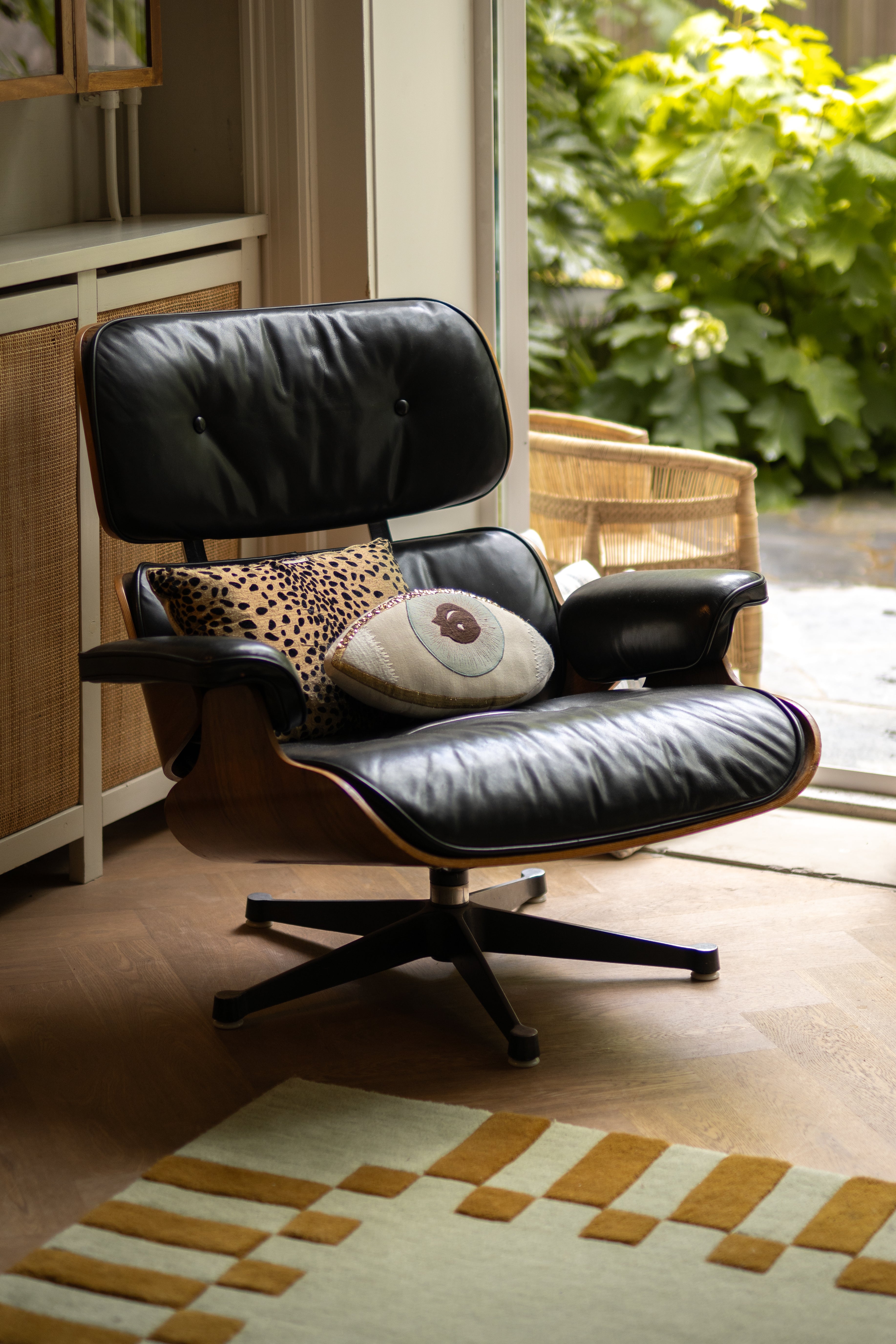 Passing through the living room, our eyes land on one of her favorite pieces from The Archive Store: the Evil Eye Pillow, hand-embroidered with golden thread and beads. “It sits on our Eames chair, and looks perfect there.”
