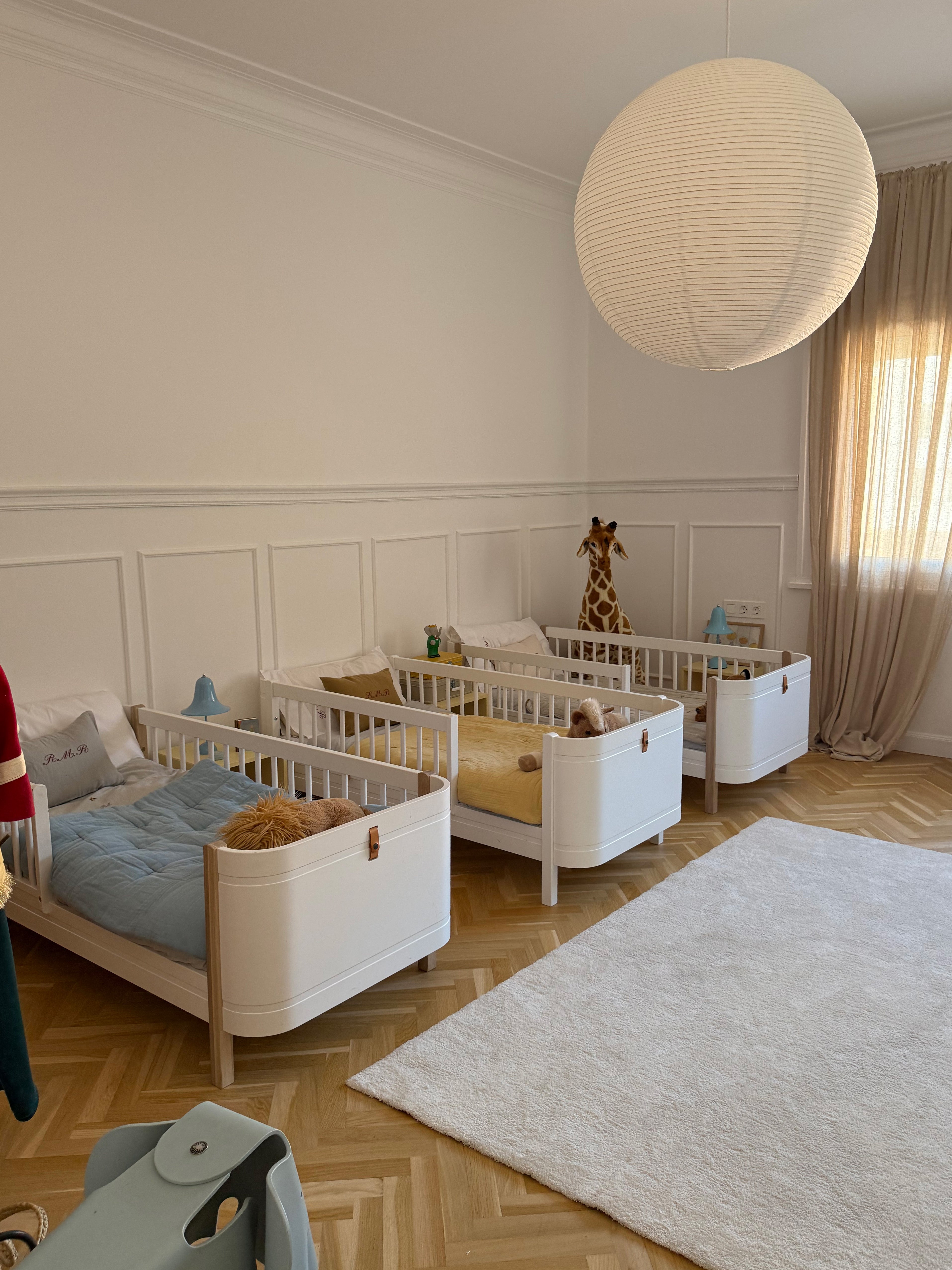 Now reimagined into three side-by-side junior beds. She loves pieces that are designed to adapt and grow with the kids. “I love that they can see each other at night. It’s their little world. It’s a space that reflects the closeness they have, and they truly love being together at night!” Silvia says.