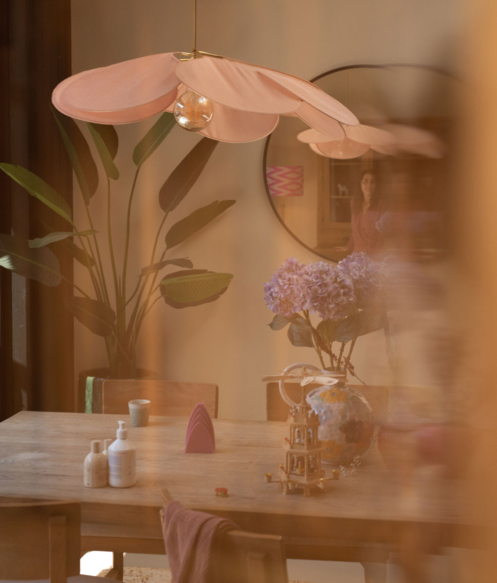 Passing by the living room, we spot the iconic Georges Store pale flower lamp above the dining table. Handmade in France in beautiful color tones, these ceiling lights add an incredible ambiance to any room.