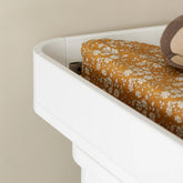 This natural design is rounded off by the leather knobs at the front of the drawers as well as the solid line of the legs. The drawers are spacious and are mounted on high quality rails with ‘soft lock’ technology when closing. The nursery plate gives a nice, secure space to care for the baby. Its form, function and quality is designed for long time use and when the nursery plate is not needed any more it can be removed easily. This leaves you with an aesthetic dresser.