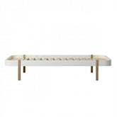 Wood lounger 90 cm, white/oak, from Oliver Furniture. Wood Lounger is a comfortable bed doubling as a stylish daybed. Given its simple and timeless design, the Wood Lounger is equally suitable for the child or teenager’s room as in the living room. In both the classic and the extended version, the quiet elegance makes it easy to combine the Lounger with furniture and objects of other styles – making it the basis for developing great visual personalities.The standard dimensions of 90 x 200 cm make the Lounger ideal in a children’s room where the space is tight, and the extended version with a width of 120 cm meets the tween’s and teenager’s need for more legroom – and perhaps a friend sleeping over. The generous amount of space is easily transformed to a cosy hang out with a personal look.