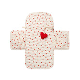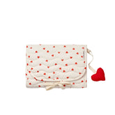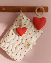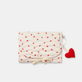 A stylish and functional essential for families on the move. Lightweight and practical, it folds easily and ties with a small ribbon. The design is simple yet thoughtfully detailed, featuring two pockets for nappies, clothes, and little essentials—keeping everything close at hand. A sweet heart-shaped toy is attached, giving tiny hands something comforting to hold during the changing time.