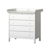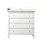 Seaside nursery dresser, 4 drawers, from Oliver Furniture, beautifully combines the nursing function with the necessary storage of baby’s clothes, diapers and muslin cloth diapers. In the dresser the clean lines are combined with the classic and timeless design which defines the Seaside Collection; a series of classic furniture for the children’s room.The Seaside nursery dresser has 4 solid and spacious drawers, which effortlessly run on high quality rails. A special ‘soft lock’-function dampens the closing of the drawers. The discretely rounded edges and the porcelain pulls combined with the dresser’s classic expression, add an element of nostalgia and finesse and create an overall harmonic expression. The nursery top covers the entire surface of the dresser, and its generous measurements give room for changing the baby, with everything necessary right at hand in the drawers below.When the nursery top is no longer needed, it is easily removed – and leaves the dresser to its purpose for many years to come. This is an aspect of Oliver Furniture’s basic philosophy: that high quality furniture is an investment for life.