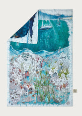 Reversible hand-illustrated muslin blanket, designed to take families on a journey from day to night. Inspired by the incredible sea life in our oceans, this blanket features beautifully illustrated fish, sea grasses, marine mammals, and molluscs, making it a perfect addition to your nursery or baby essentials.