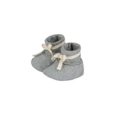 These baby booties from Gray Label have the shape of a sock. They are made from soft organic cotton and a little elastane fleece to ensure a comfy fit. They have a rib knitted double layered folded cuff and a herringbone lace to tighten. The logo is stitched on the sole of the right bootie.