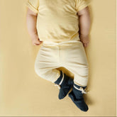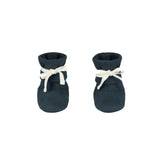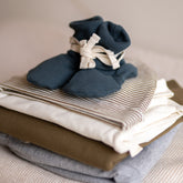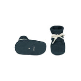 These baby booties from Gray Label have the shape of a sock. They are made from soft organic cotton and a little elastane fleece to ensure a comfy fit. They have a rib knitted double layered folded cuff and a herringbone lace to tighten. The logo is stitched on the sole of the right bootie.
