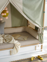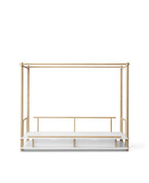 The oak framed bed, with its beautiful craftsmanship, hidden screws and practical drawers underneath, can easily stand alone, but the design really comes into its own with one of the bed canopies created for the bed. The canopy bed can be styled with one of the four canopies, creating a safe environment for the night and a platform for daydreaming and playing during the day.