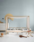 Camp Bed Canopy Kyoto creates a simple, airy expression with a thin cotton fabric covering the ceiling and the two narrow sides. Just like the Japanese shoji doors in rice paper create the famous soft light, the bed is transformed with a blink of an eye into a breathing space of aesthetic calm, where all kinds of play can unfold or lean back with a pillow behind the back and an audiobook in the ears. Similar to seeking shade from the sun on a sandy beach, the custom-made fabric is mounted with ribbons tied around the bed frame - a poetic part of the design. It creates shade from the morning sun of everyday life and protects dreams of the night from sharp pencils and two plus two making four.
