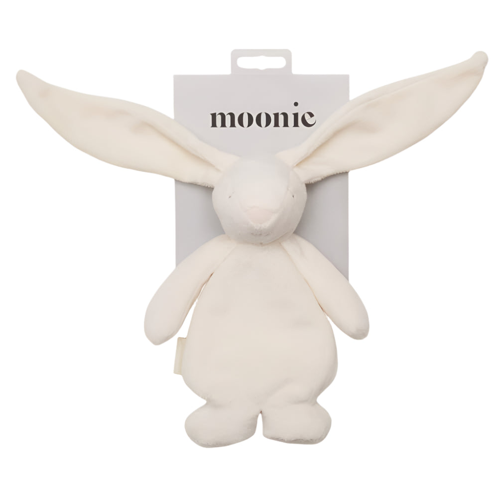The 5 sounds of the Moonie Friend are non-computer generated but real recordings of natural pink noise, a real heartbeat, sea waves and the sound of the mountain stream. The bunny also has a calming lullaby composed on a kalimba, especially curated for newborns. The Moonie's soothing sounds filters out the sounds from the surrounding and ensures children a calm and peaceful sleep.