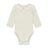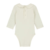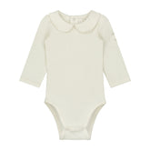 This long-sleeved baby body is crafted from soft organic cotton jersey with a hint of elastane for a snug yet comfortable fit. Designed with a delicate collar finished with babylock stitching, it features a practical press button closure at the crotch and an elegant back placket with snap buttons. The Gray Label logo is subtly stitched just below the neckline — a refined detail for everyday wear.