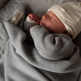 Soft knitted merinowool baby blanket Hazel in light grey melange color. Merino wool is renowned for its excellent temperature-regulating properties, keeping your little one warm in winter and cool in summer.