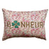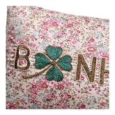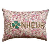 Light Pink Liberty print cushion from CSAO comes in an all over print of pastel colored flowers. It features embroidered clover in green and a gold embroidery of the word Bonheur.