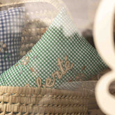 Green checkered mini cushion with gold Liberte embroidery.