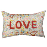 Pastel mini cushion with flower print and  LOVE embroidery in red.