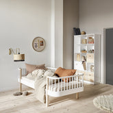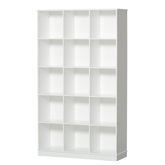 Wood shelving unit 3×5 with base from Oliver Furniture. This high shelving unit in classic Nordic style consists of 15 compartments – 3 horizontal and 5 vertical, which stand on a base. It is a new design by Oliver Furniture and forms part of the Wood Collection. The simple design gives this shelving unit a light expression with a Nordic concept and makes it easy to enjoy keeping order in it. It is ideal for a children’s room, but is just as well suitable for any other room in the house. Toys, books and many more things can be stored easily. In addition there are storage boxes that can be placed individually into the shelf.