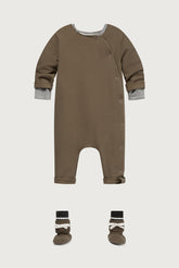 Crafted from our softest organic cotton fleece, this baby jumpsuit is designed with comfort and simplicity in mind. It features a classic round neckline, delicate overlock edge finishes, and practical snap buttons running from the neck down to the feet for easy changing. Gray Label signature logo is subtly embroidered on the back, just below the neckline — a quiet mark of quality and care.