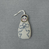 Add a touch of charm and artistry to your home with this handmade Nesting Doll Ornament by Skippy Cotton. Each piece is carefully crafted from natural fabric and beautifully embroidered, featuring a whimsical face and delicate bow design. Perfect as a Christmas tree ornament, a nursery decoration, or a special gift for design lovers, this doll embodies the unique style and storytelling of Skippy Cotton’s creations.