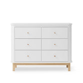 Oliver Furniture - Nursery Dresser 6 drawers white/oak - 041359. Nordic oak meets classic white lines in our new Wood nursery dresser. This natural design is rounded off by the leather knobs at the front of the drawers as well as the solid line of the oak legs. The 6 drawers are spacious and are mounted on high quality rails with ‘soft lock’ technology when closing. The nursery plate gives a nice, secure space to care for the baby. Its form, function and quality is designed for long time use and when the nursery plate is not needed any more it can be removed easily. This leaves you with an aesthetic dresser.