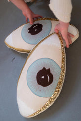 This evil eye cushion is handmade in NY, made out of cotton and linen fabrics embelished with golden stitches and beads. The symbol of an Evil Eye is supposed to bring guidance and peace and fend off evil, and since no evil will befall you, it is assumed that it also brings luck.