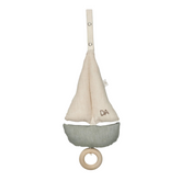 Beautiful hand-embroidered musical mobile that plays a gentle lullaby when you pull the string. A charming addition by the crib or above the changing table. The little boat is made from soft, natural linen in lovely muted tones, giving it a calm, vintage-inspired look.
