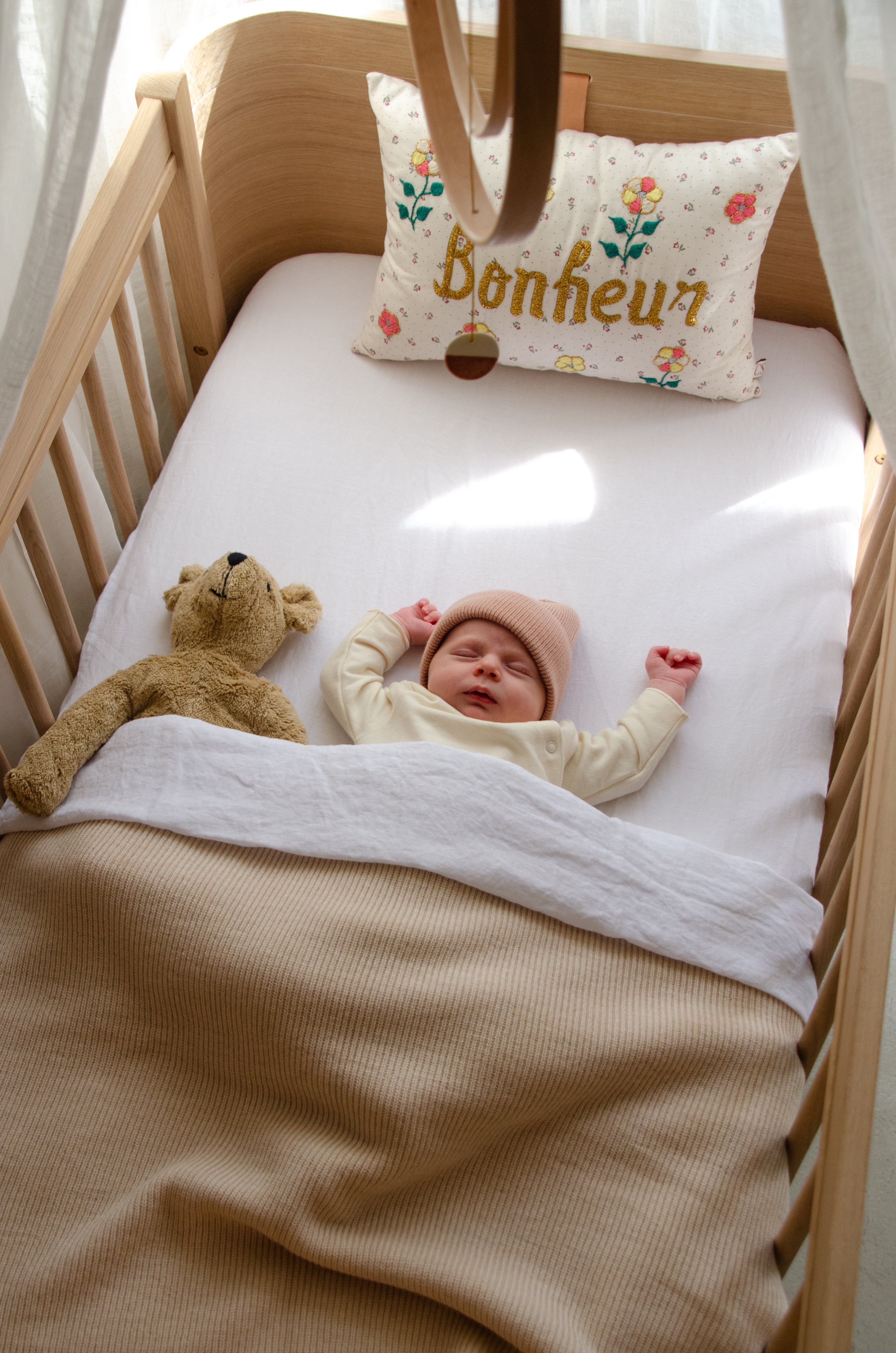 Underneath your woolen blanket, you can use a flat sheet to tuck in your baby. A tip from us: instead of a flat sheet, you can use a large swaddle that matches your bedlinen as well. You need many of them anyways and they’re so multifunctional! Plus, it will protect your woolen blanket.