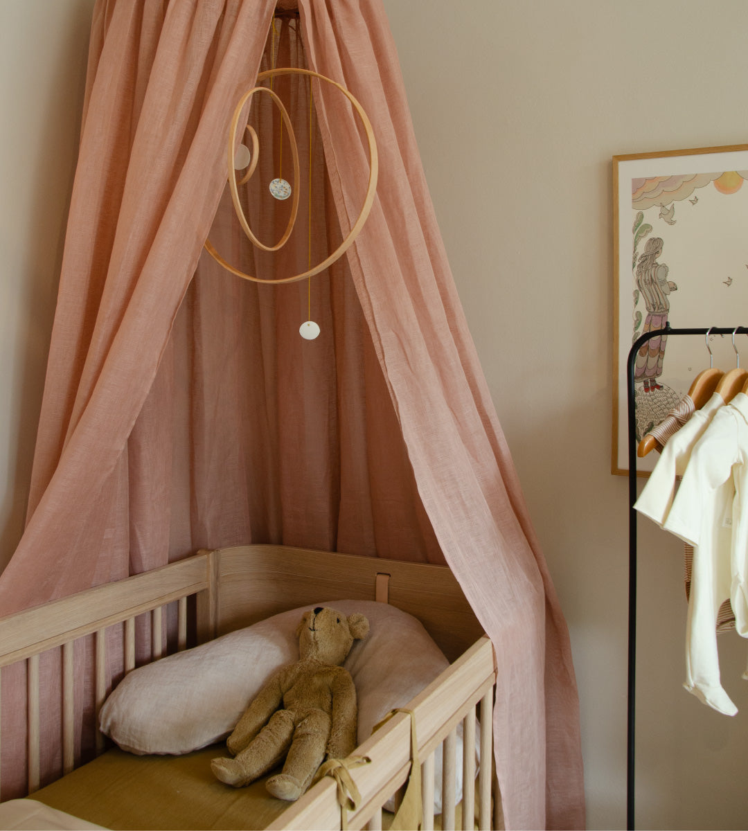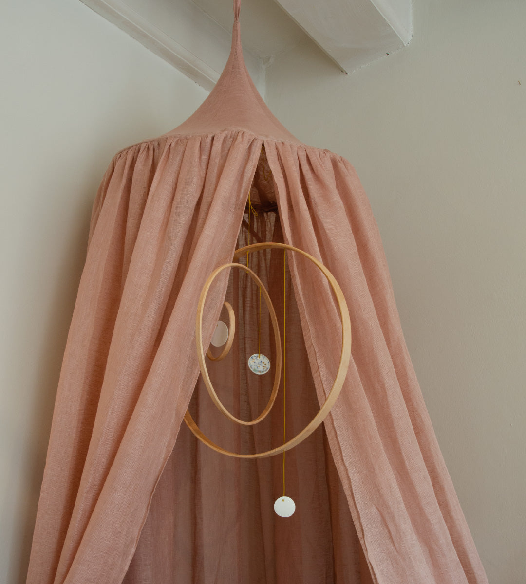 the bed canopy in Misty Rose. Perfect to hang over the bed for your baby’s nap, and in the older kid’s room, it's ideal for creating cozy corners to play. And it's made from the finest quality linen.