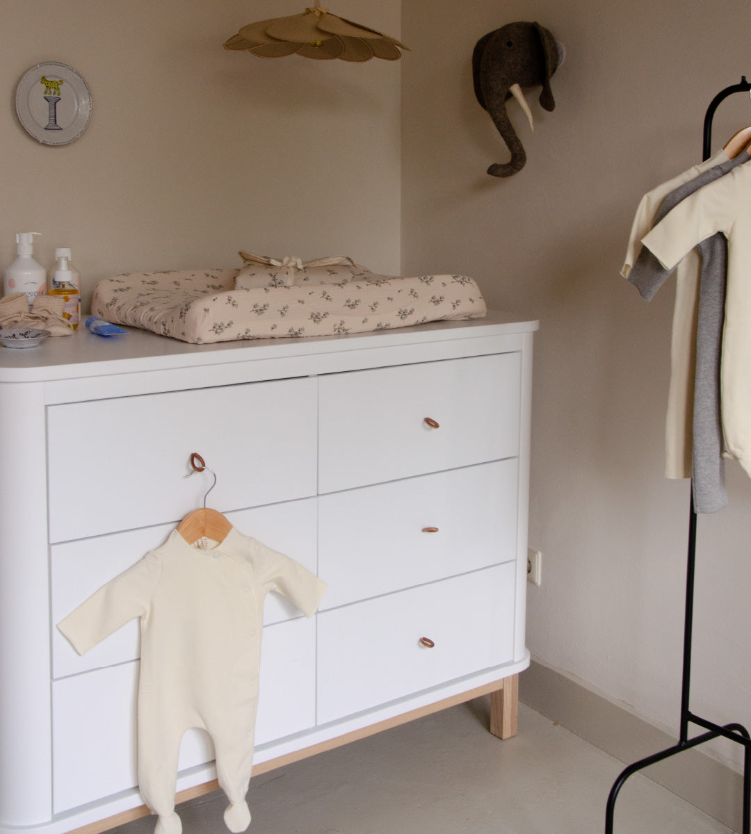 Nordic oak meets classic white lines with Oliver Furniture's Wood nursery dresser. This natural design is rounded off by the leather knobs at the front of the drawers as well as the solid line of the oak legs. The 6 drawers are spacious and are mounted on high quality rails with ‘soft lock’ technology when closing. The nursery plate gives a nice, secure space to care for the baby. Its form, function and quality is designed for long time use and when the nursery plate is not needed any more it can be removed easily. This leaves you with an aesthetic dresser.