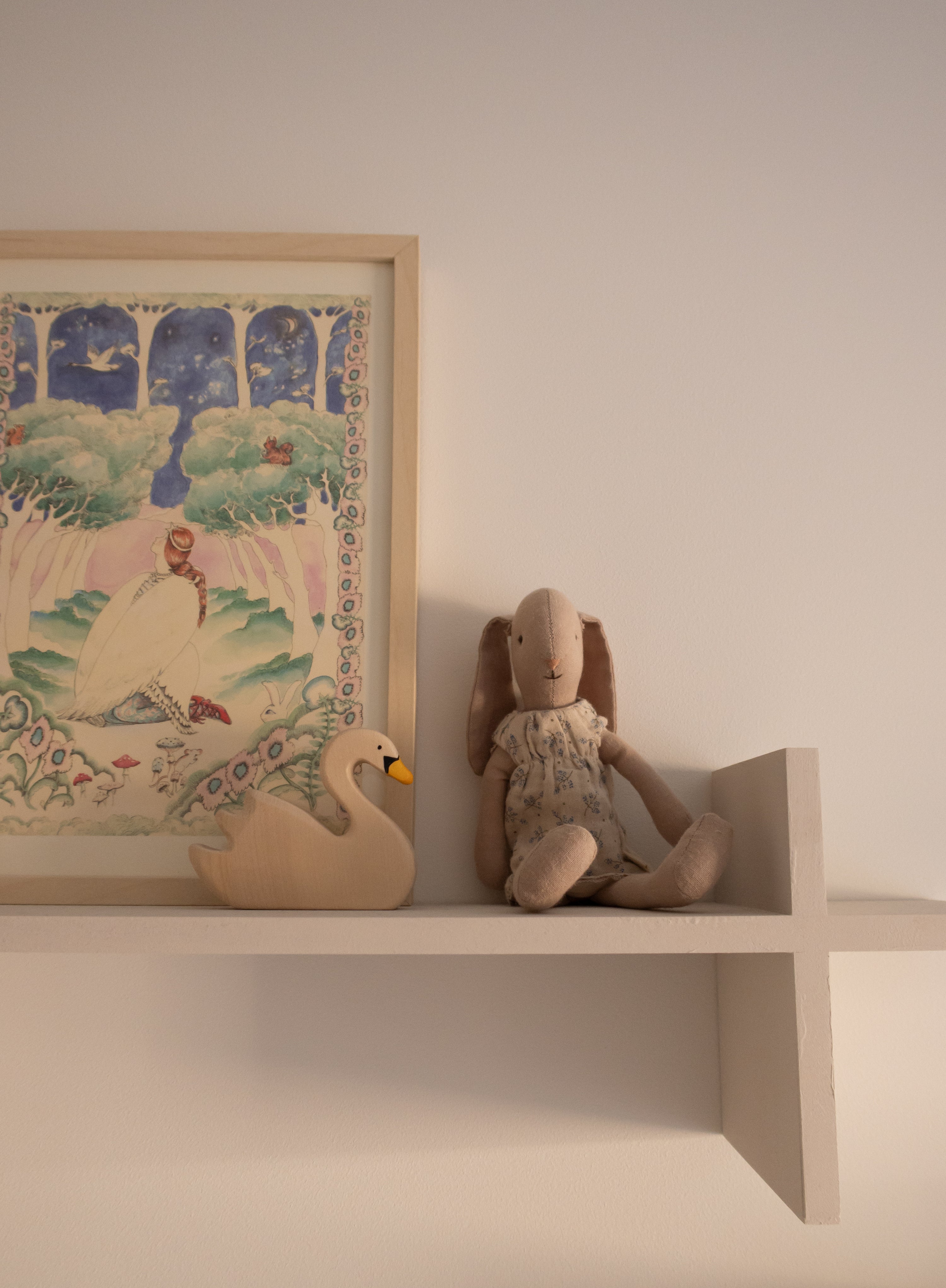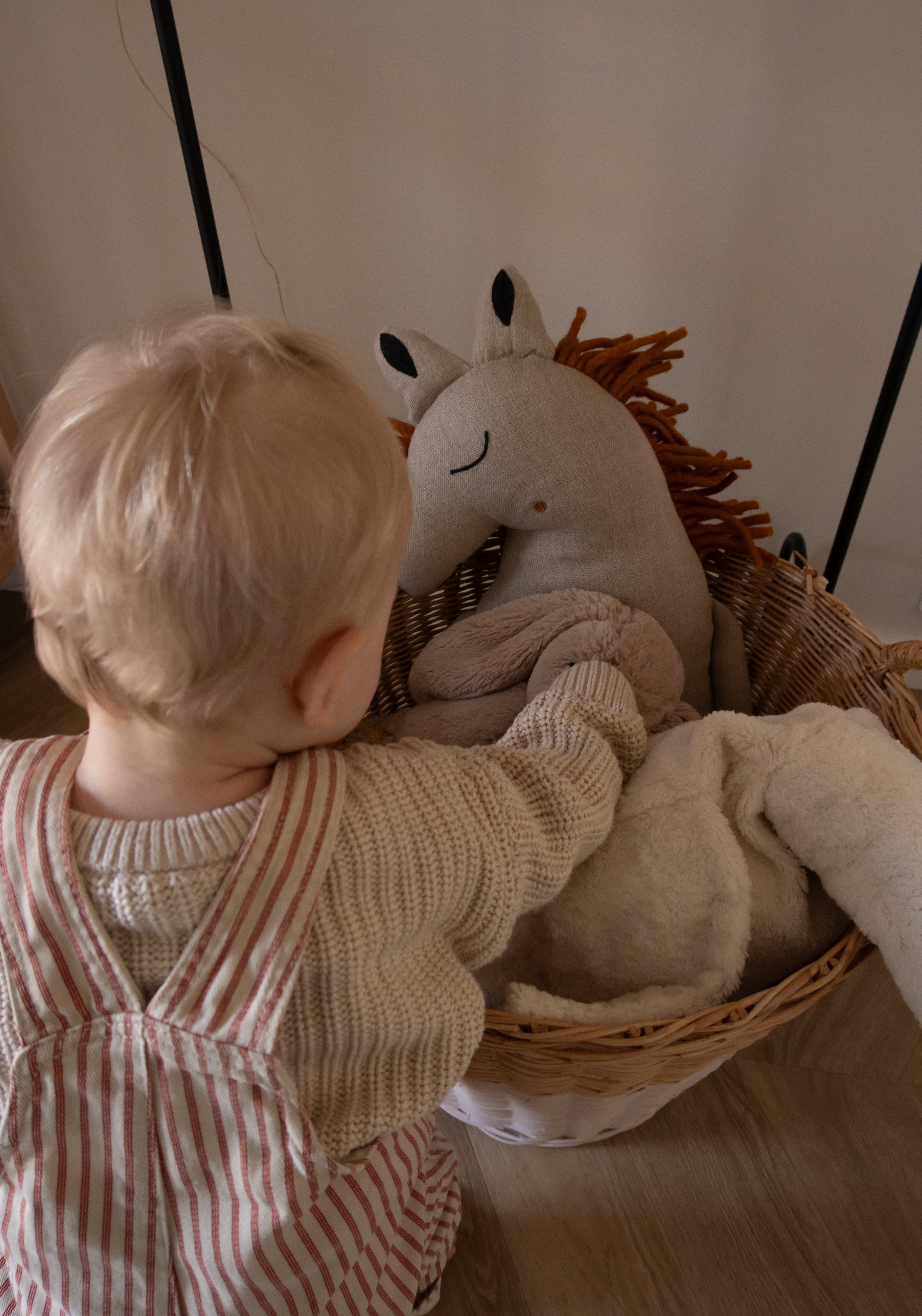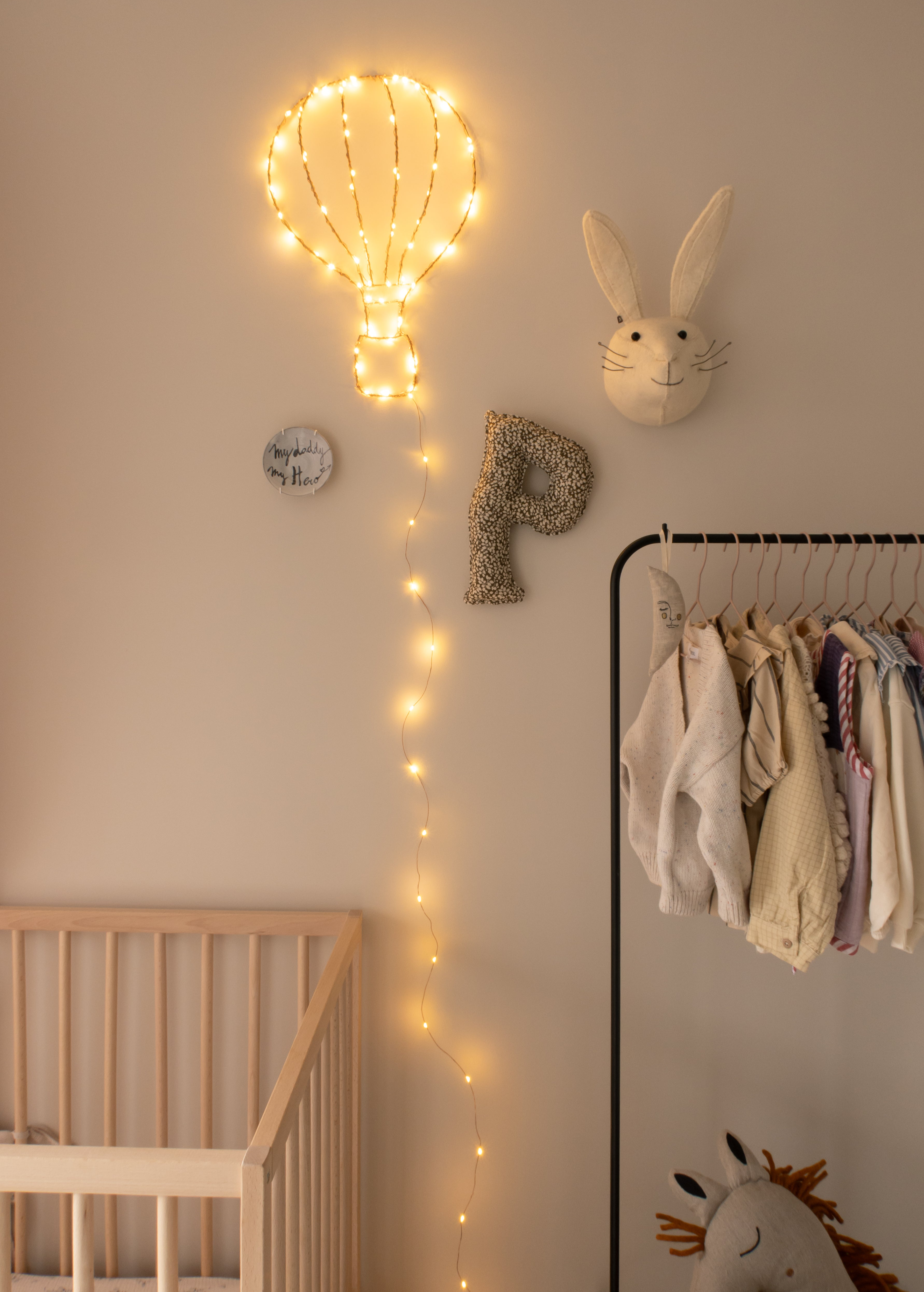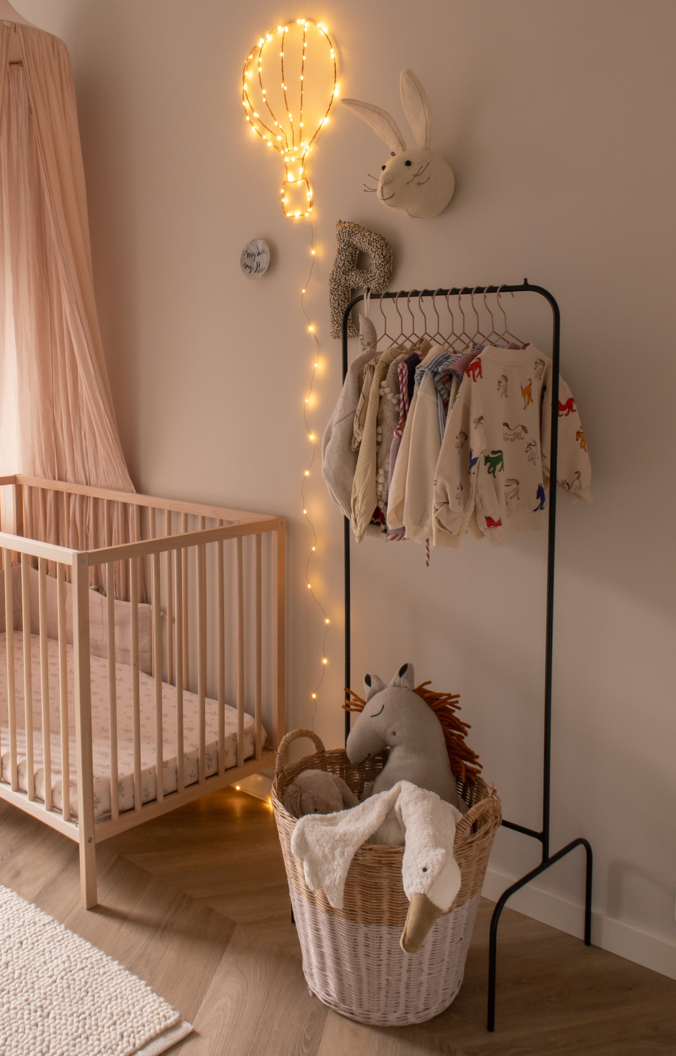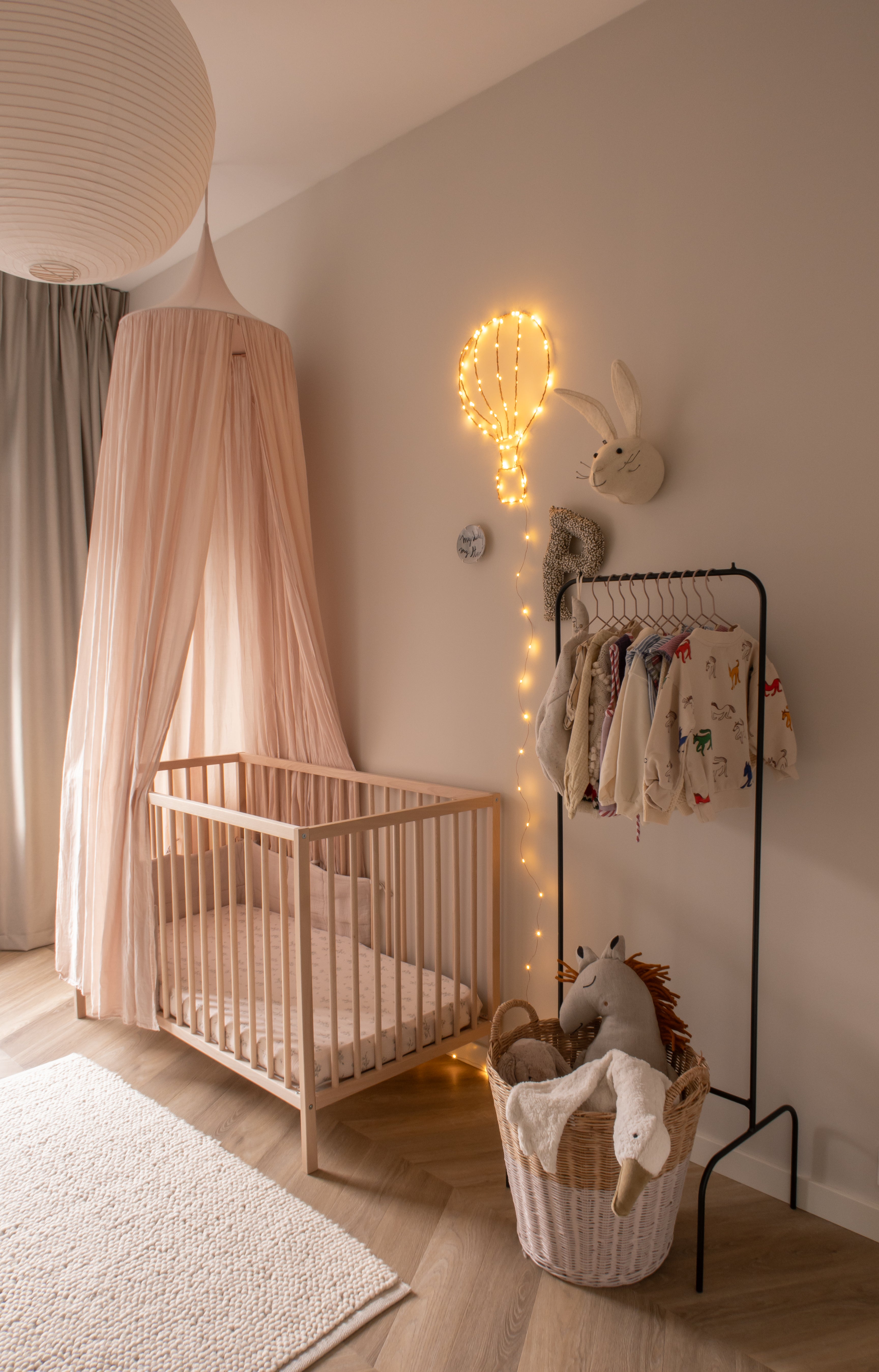 Start with a neutral base and add color and playfulness through cushions, sheets, rugs, and wall decorations. This way, it’s easy to adjust the room as your child grows and their preferences change. For example, I’ve held off on wallpaper for now, as I’d love Pleun to have a say in that when she’s older. Creating a warm atmosphere is key, and materials like wood, linen, and cotton really help achieve that.