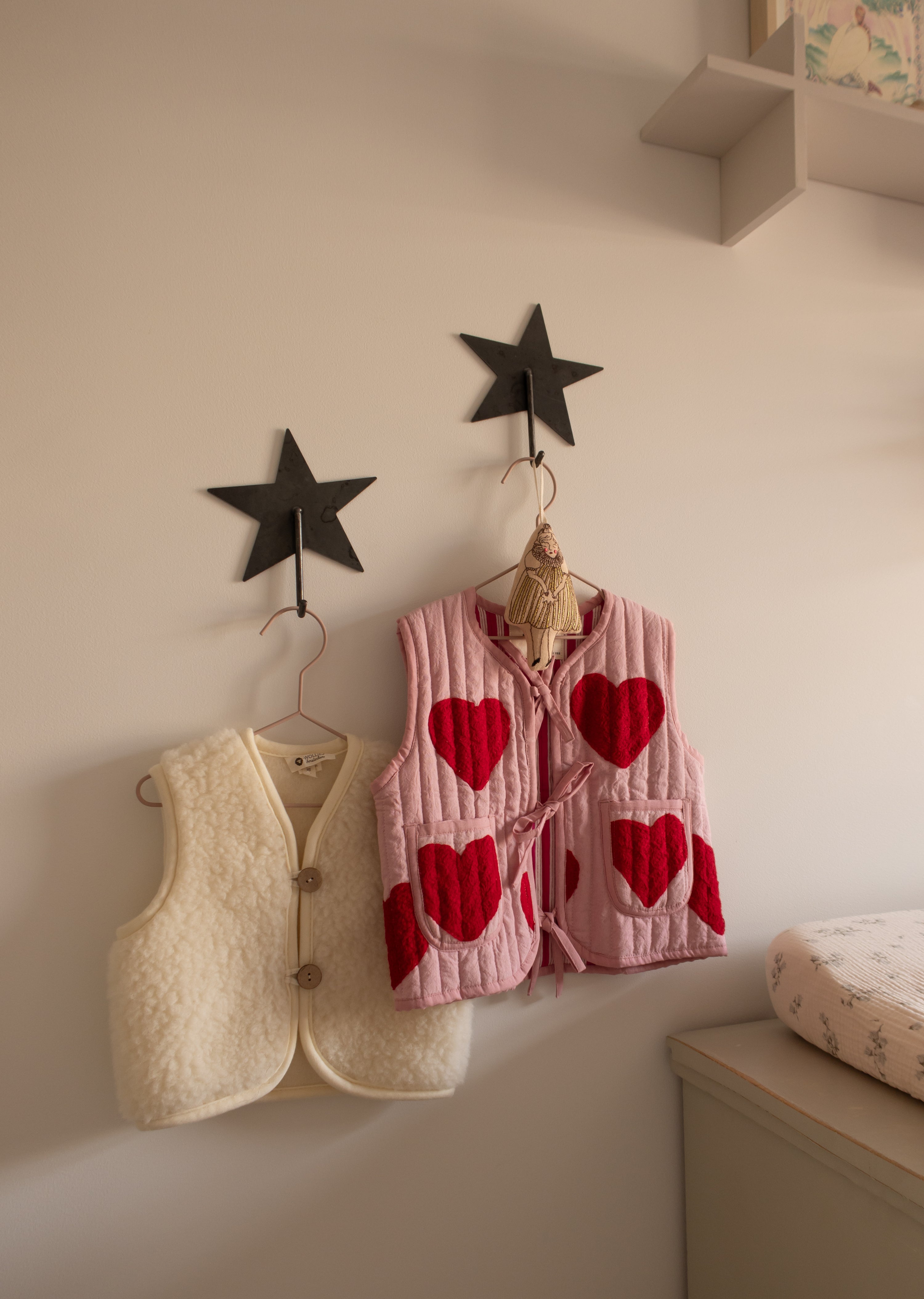 For Pleun’s room, I chose a light neutral base with warm materials. The vintage dresser adds so much charm, and I also added a canopy above her bed for a cozy and inviting feel. Besides that I focused on storage solutions to keep the space tidy. Instead of hiding all her beautiful clothes in a closet, I opted for a metal clothes stand and star hooks on the wall to show them off!