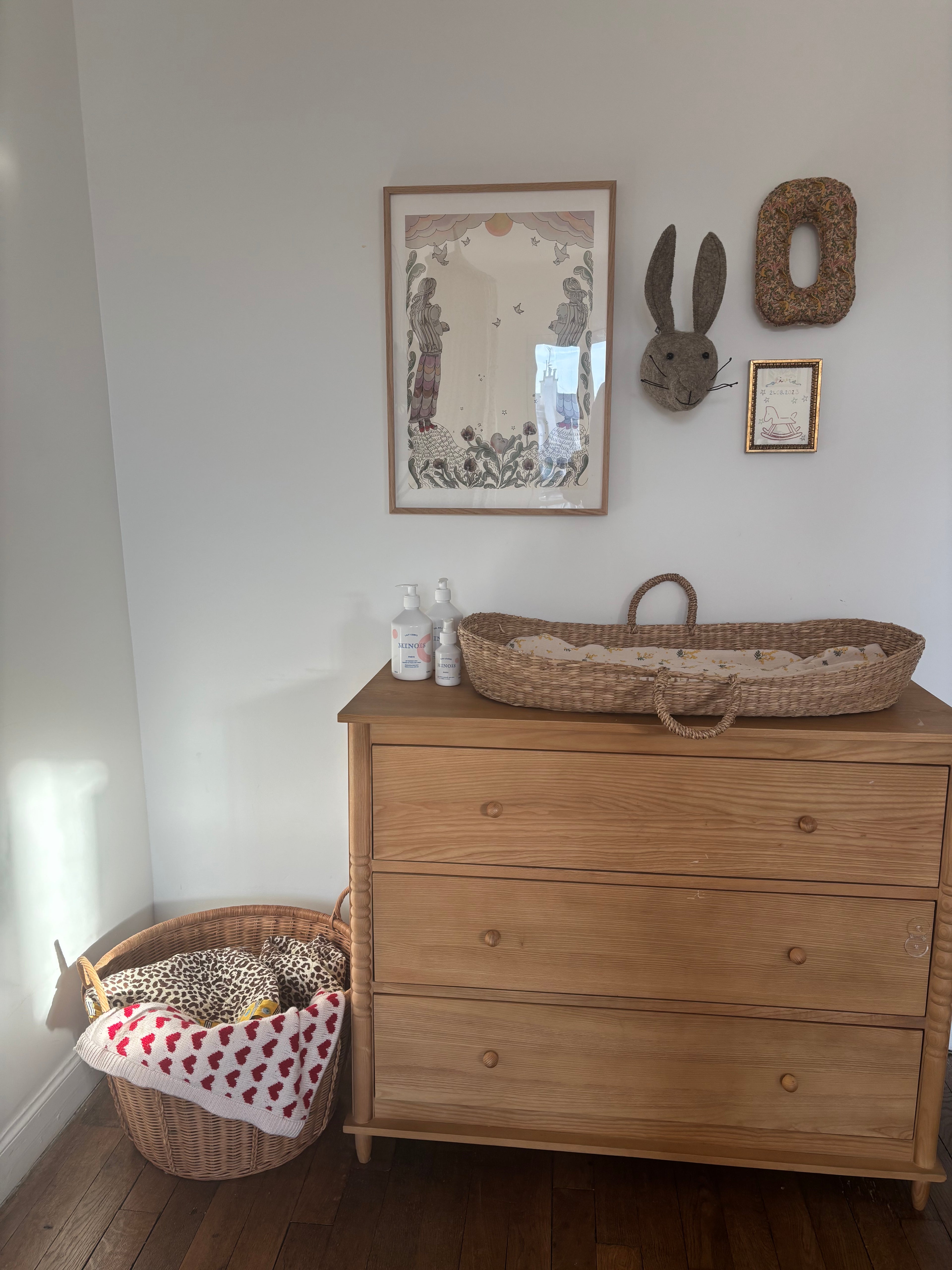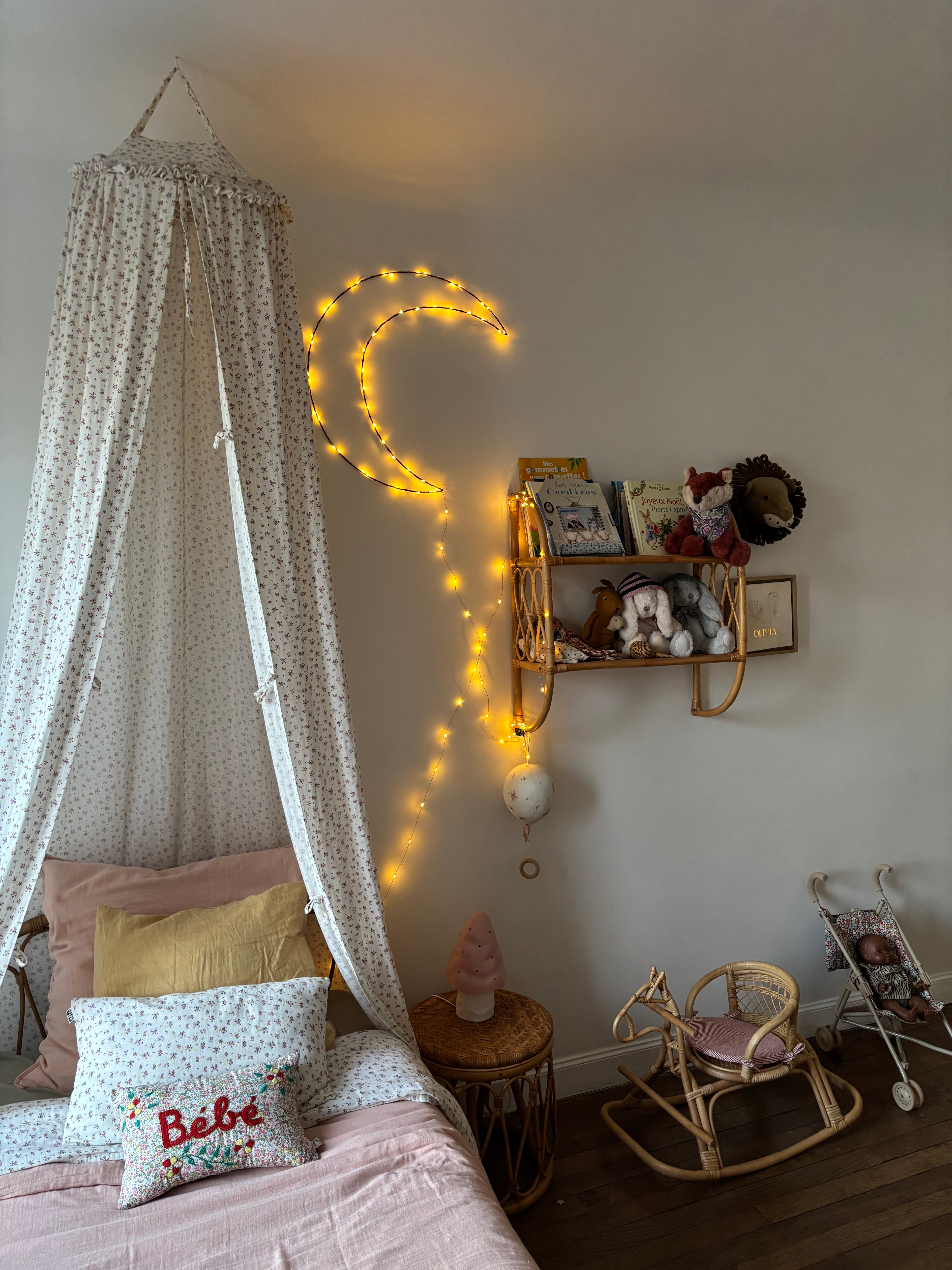 When it comes to Olivia’s room, Paula wanted to keep things simple yet meaningful. The room started with a few key pieces: a Bonton Bohème bed, a cozy Zoé Rumeau moon light, and a soft bed canopy. But what makes it special are the personal touches—like the Fiona Walker lion head (because Olivia is a Leo!) and framed handprints.