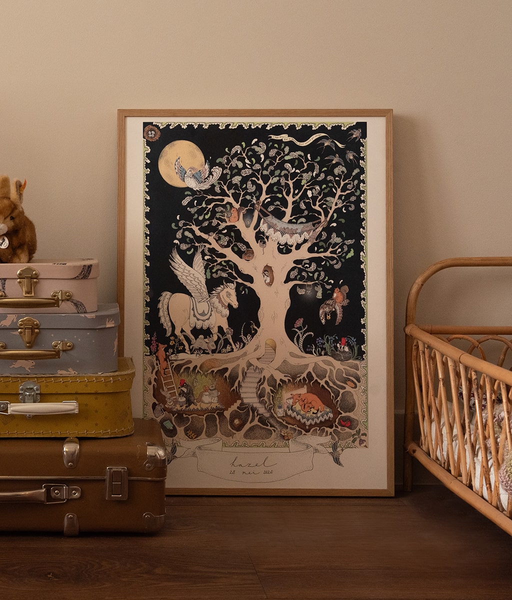 Neem een kijkje in Hazels knusse hoekje en ontdek de Forivor Geboorteposter Enchanted Forest! Gepersonaliseerd met haar naam en geboortedatum, voegt deze betoverende poster een vleugje magie toe aan elke kinderkamer. Een perfect cadeau voor de kleinste avonturiers!