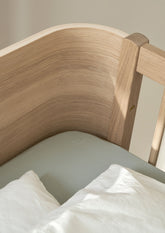 De Wood Mini+ Ledikant in eikenhout is gemaakt van wit geolied massief eiken en gevormd berkenhout met een eikenfineer. De serie wordt geproduceerd in Europa en voldoet aan de Europese veiligheidsnormen en standaarden. De producten zijn behandeld met niet-giftige stoffen zoals gepigmenteerde olie op basis van lijnzaad-, zonnebloem- en jojobaolie.