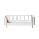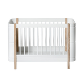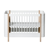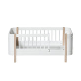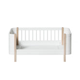 Oliver Furniture - Wood Mini+ (COT/BED 0-9 JAAR) in wit/eiken - 041425. Het nieuwe bed Wood Mini+ van Oliver Furniture is ontworpen om te voldoen aan de behoeften van het kind van 0-9 jaar – van het eerste babybedje tot het verlangen van een schoolkind om te slapen in een bed dat lijkt op dat van volwassenen. Dit bedje kent 5 verschillende standen. Als het kind uiteindelijk het bed ontgroeit, tovert een paar mooie kussens langs de rugleuning het om tot een knus ligbed of kleine bank - geschikt voor een hoek van de woonkamer, een brede gang of als stijlvolle aanvulling op het interieur van het tuinhuis. Tevens kan het bed omgebouwd worden tot een hoogslaper en stapelbed met een conversion kit.