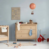 De Wood Commode met 3 lades in eikenhout met groot verzorgingsblad (041370) straalt warmte en natuurlijke elegantie uit en is daardoor een stijlvolle en functionele toevoeging aan de babykamer. Het beschikt over drie ruime lades, elk verdeeld in twee compartimenten, die voldoende opbergruimte bieden voor kleding, luiers en beddengoed, zodat alles binnen handbereik is zonder uw aandacht van de baby af te leiden.