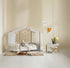 The canopy is made of transparent, organic muslin cotton, giving it a light, airy, and natural look. The fabric drapes elegantly from the bed’s wooden frame, creating a cosy, protective atmosphere without feeling heavy. It offers the child a calm space for play and relaxation.