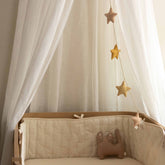 Zachte bed bumper van Dear April van doorgestikte katoen met lintjes om stevig aan je ledikantje te kunne bevestigen. De bumper bekleed ongeveer het halve bedje en geeft een geborgen nestje voor je kleintje.