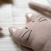 De kleur is licht grijsbruin met geborduurde details zoals schattige roze oortjes, zwarte oogjes, snorharen en een schattig neusje. En als je onder de staart kijkt, zie je nog een klein detail dat je misschien aan het lachen maakt.