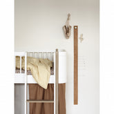 Oliver Furniture - Wood Mini+ laag hoogslaper wit/eiken 68x168 cm - 041447. Wood Mini+ laag hoogslaper is ontworpen om tegemoet te komen aan de behoefte aan een kwaliteitsoplossing in een kleine kinderkamer. Met zijn royale afmetingen maar kleine gestalte, is hij zeer geschikt in kamers waar een standaard stapelbed lijkt te domineren. De lage hoogslaper past bij het jonge schoolkind en biedt door zijn doordachte ontwerp een ruimte onder het stapelbed waar het kind een gezellige hangplek kan creëren. Wanneer het kind uiteindelijk het bed ontgroeit, kunnen een paar mooie kussens langs de rugleuning en een set korte poten die apart verkrijgbaar zijn, het omtoveren tot een gezellig divanbed of een kleine bank die geschikt is voor een hoek van de woonkamer, een brede gang of als een stijlvolle aanvulling naar het interieur van het tuinhuis..