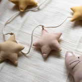 A garland is a wonderful addition to a child's room. On a canopy bed or a cot bed, as a wall decoration or in a window. This garland has 6 stars in 3 shades of yellow and soft pink on a cotton cord.