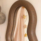 De spiegel heeft een diepe, warme bruintint met subtiele spikkels, gemaakt van gerecyclede flessen schoonmaakmiddel. Deze koffie kleur voelt zacht en natuurlijk aan, een rustige tint met karakter.