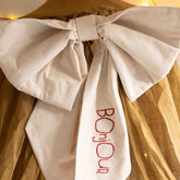 Elke strik wordt met de hand gemaakt van stof. Door de manier waarop de strik wordt genaaid en omgekeerd, kan er aan de achterkant van het lint een kleine opening (ongeveer 10 cm) zichtbaar zijn. Als dit kleine gaatje te zien is, kun je de strik voorzichtig oppluizen en bijstellen — het verdwijnt vanzelf netjes achter de lus.
