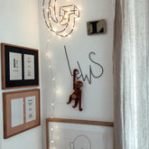 Handmade natural wooden pram chain from Manjewell, with iron bells and elastic cord.