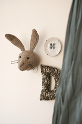 Grijze vilten hazenkop, mini, ontworpen door Fiona Walker. Een prachtig vervaardigde eye-catcher voor in de kinderkamer, speelkamer of woonkamer. Elke dierenkop is handgemaakt en heeft daardoor hun eigen unieke karakter. De haas is volgens Fairtrade richtlijnen geproduceerd.