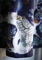 Super soft large muslin by Forivor. Hand illustrated on one side of the muslin, three children can be glimpsed among the large branches of an old ash tree, finding unfamiliar faces in the cloud formations and spotting birds. On the other side of the muslin, light has faded to dark and giant moth air balloons carrying children rise up in a star lit cosmos. The caterpillars have transformed into incredible regal moths and a pair of trumpeting bees guard the magic pink sap of the ash tree. The collection is a love song to the air around us and all the creatures that inhabit it, from pollinating moths, to rhinoceros beetles and rare migratory birds.